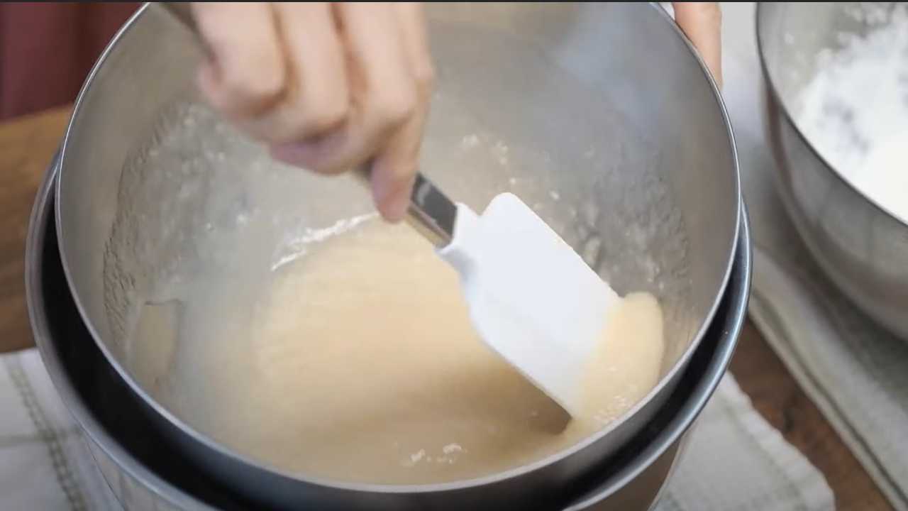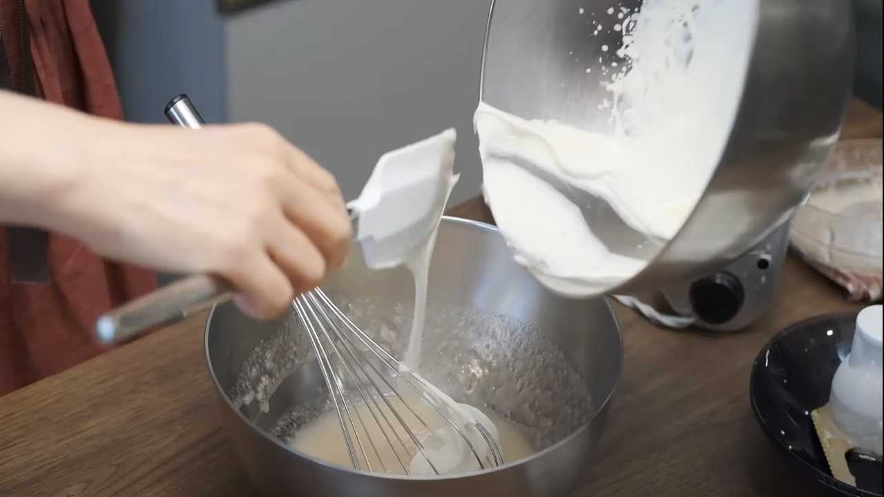 残りの生クリームが入っているボウルに先ほど混ぜ合わせたものを入れて混ぜ合わせる。