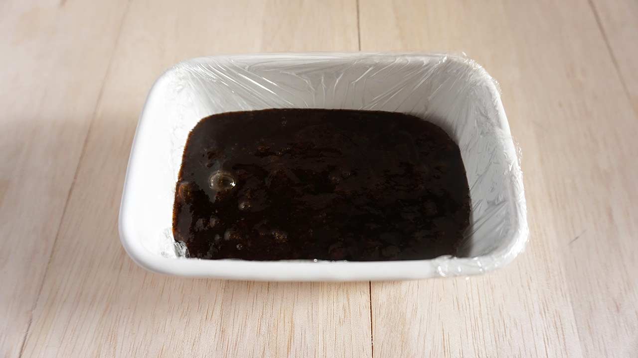 鍋から剥がれてぷるっとした塊になったら、こちらもタッパーに移して冷蔵庫で冷やし固めます。