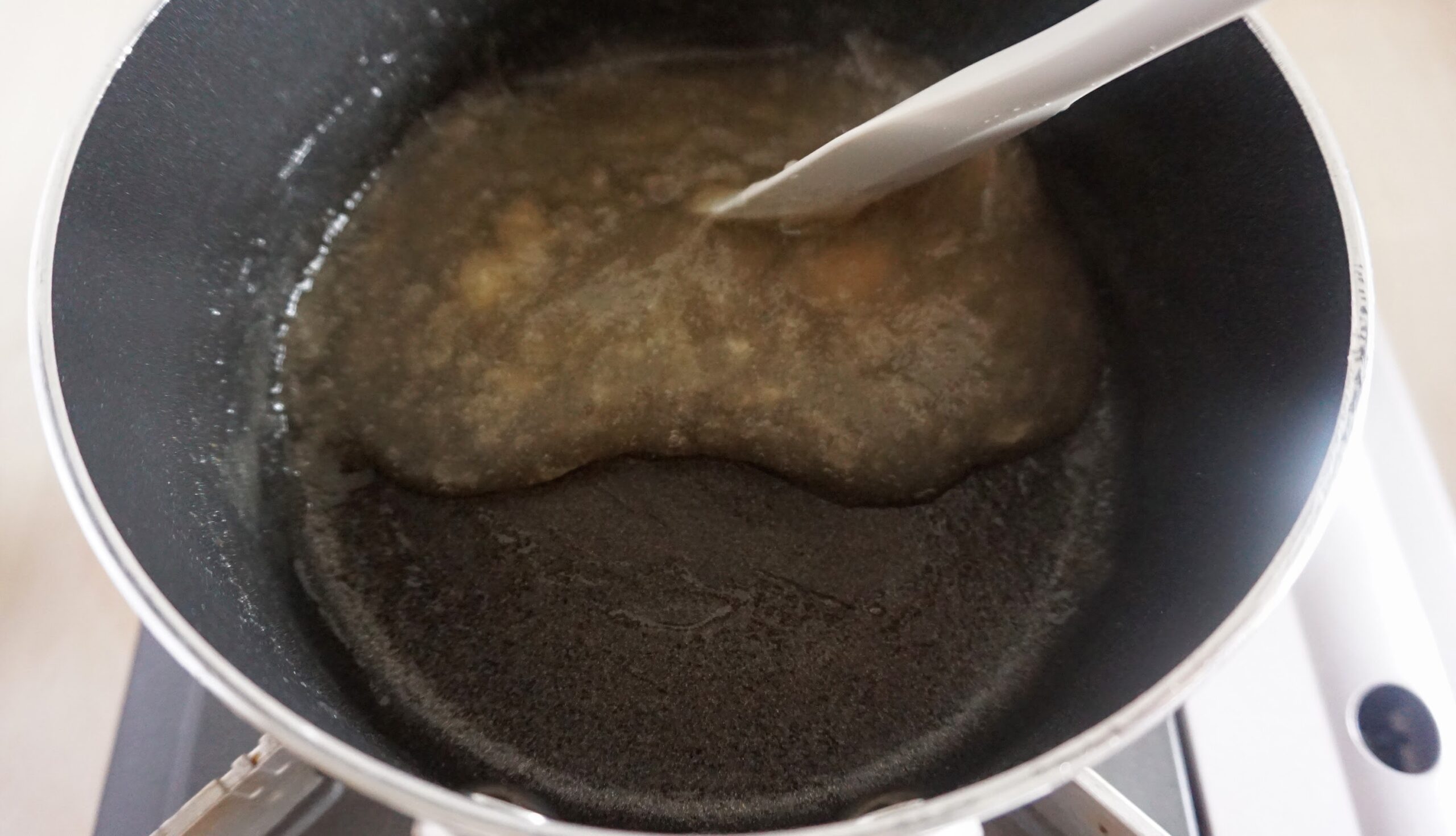 サイリウムを加え切ったら、そのまま火にかけた状態で手を止めずに混ぜ続けます。