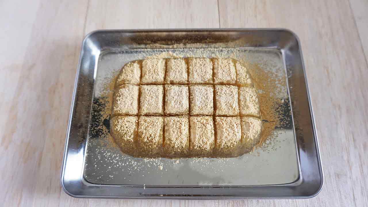 冷え固まったわらび餅をバットに移し、きな粉をふりかけてカットします。