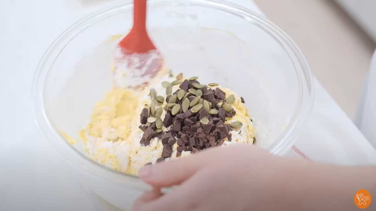 刻んだチョコレートとかぼちゃの種を加えて、粉っ気がなくなるまで混ぜる。- 10