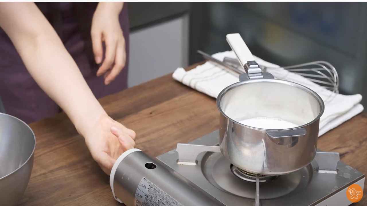 鍋に牛乳とグラニュー糖の半量を入れ、砂糖が溶けてフツフツと沸く程度まで温める。