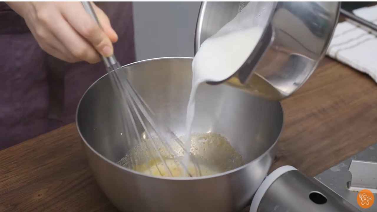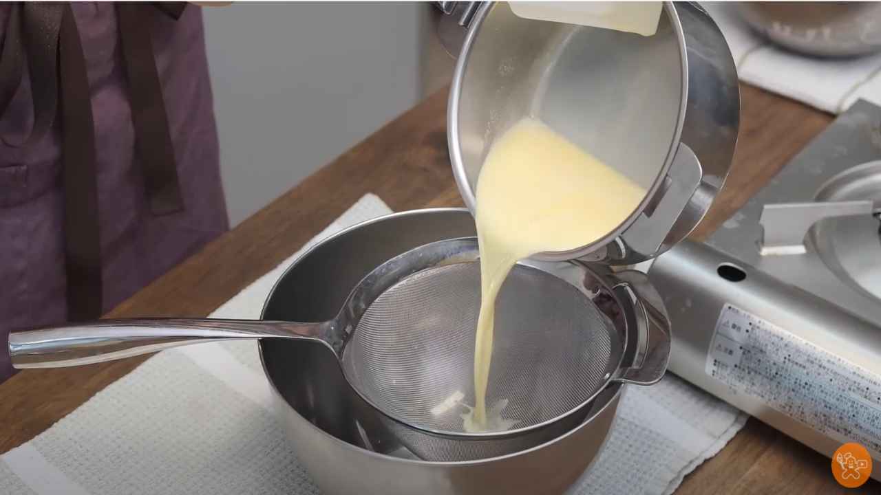 ボウルに卵黄、残りのグラニュー糖、はちみつを入れてホイッパーで混ぜる。温めた牛乳を入れて空気を入れながらよく混ぜ、鍋に戻す。