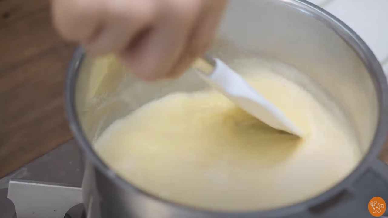 鍋を弱火にかけ、ゴムベラで沸騰させないように混ぜながらとろみをつける。真ん中をゴムベラで動かしたときに鍋の底が見えるくらいのとろみになったら火を止める。