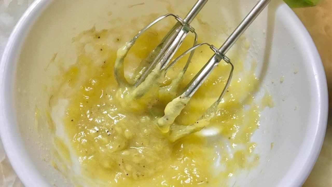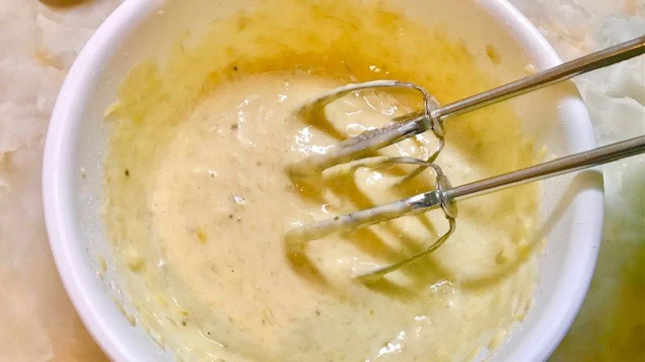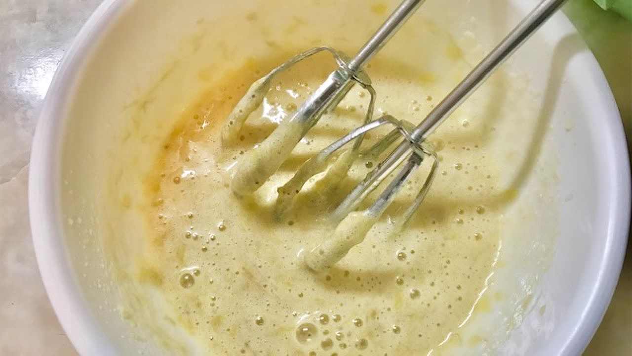 1へ溶き卵を混ぜたら、米油を加えてハンドミキサーで混ぜ合わせます。