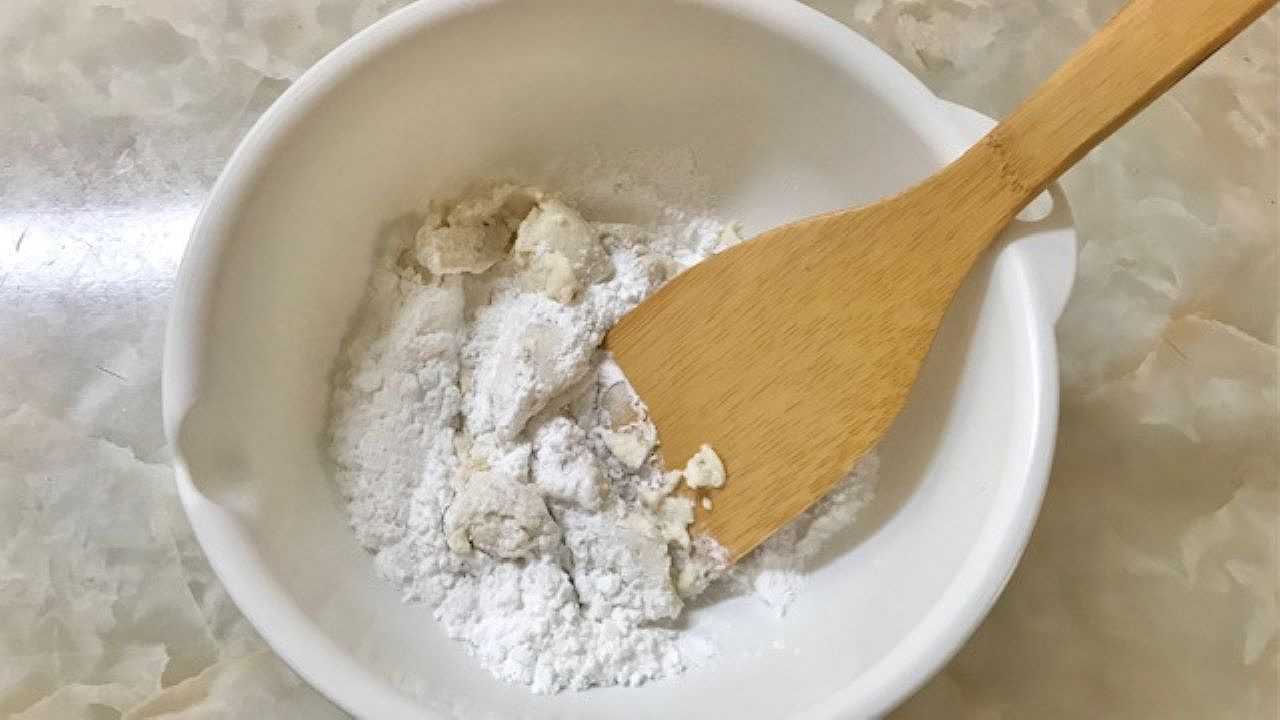 ボウルに米粉と砂糖、絹ごし豆腐を入れて丁寧に混ぜ合わせます。