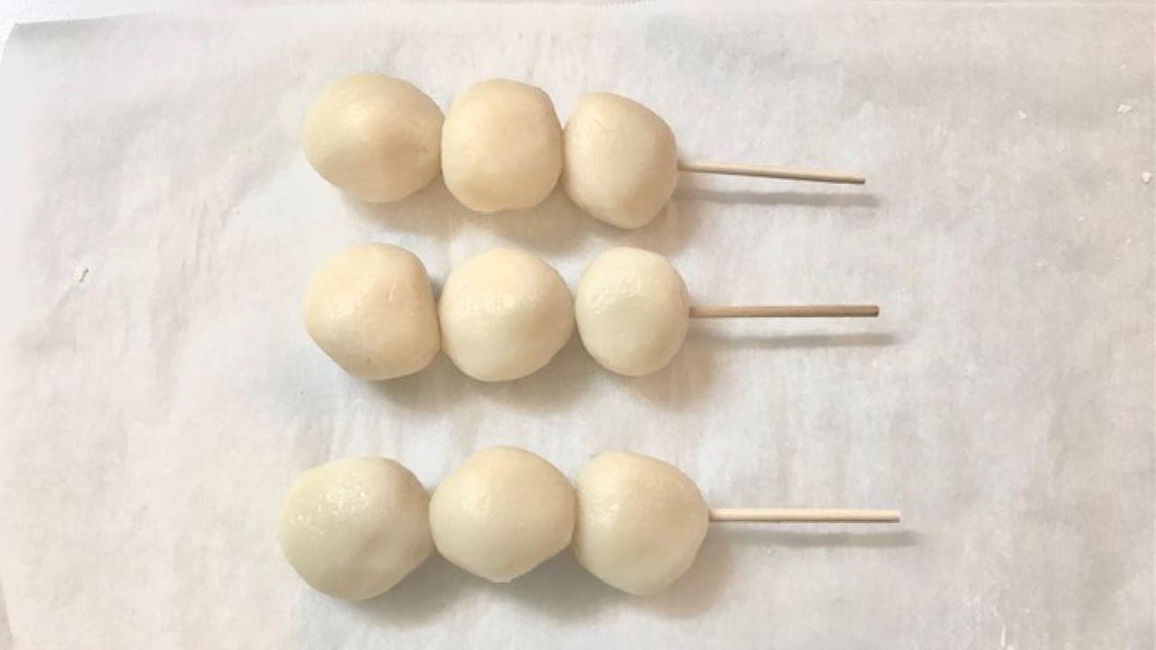 団子を竹串に刺します。お好みでグリルに入れて表面をこんがり焼き、たれを塗って完成です。あんこやきなこなどをまぶしても美味しく召し上がれます。