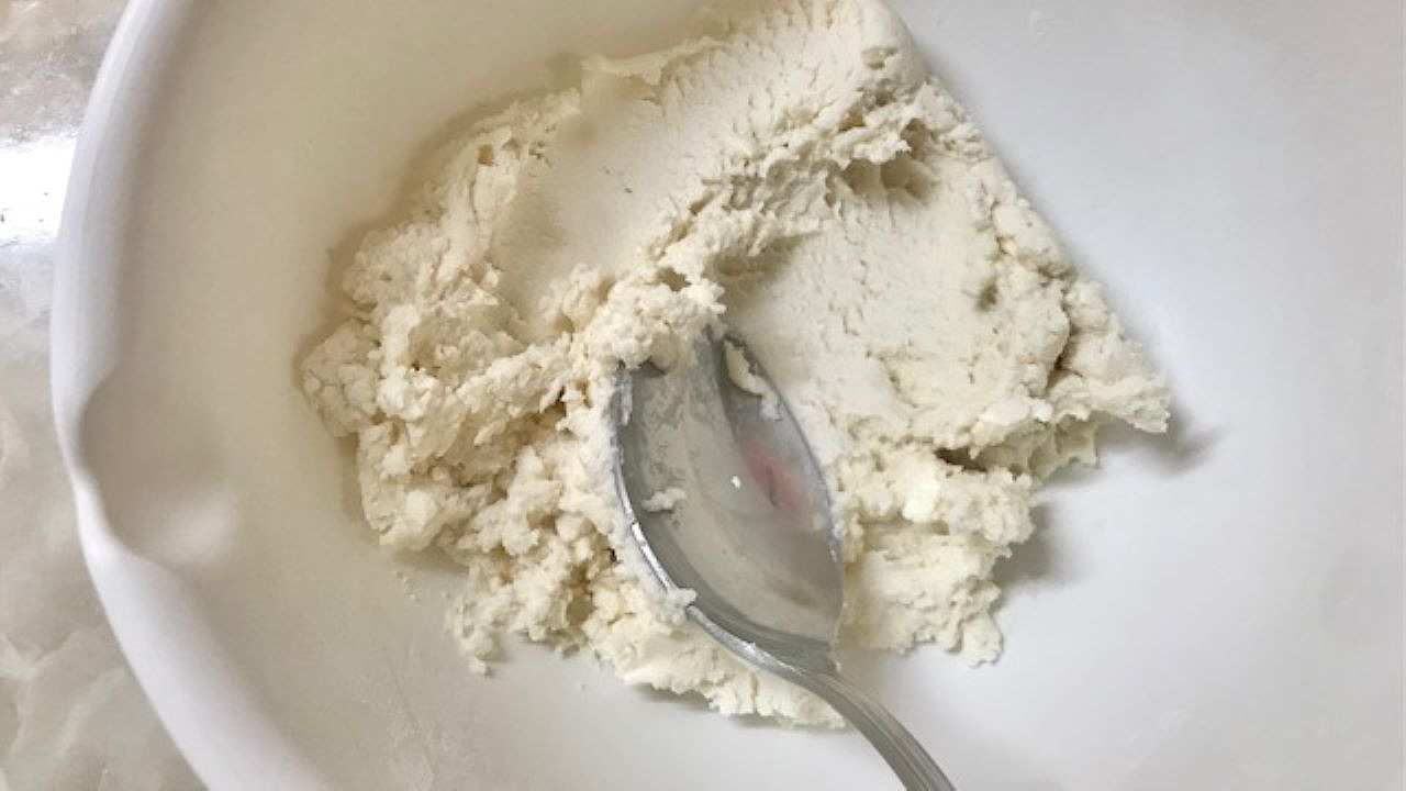 スプーンの背を利用してボウルの壁面にこすりつけるようにすると、まとまりやすいです。