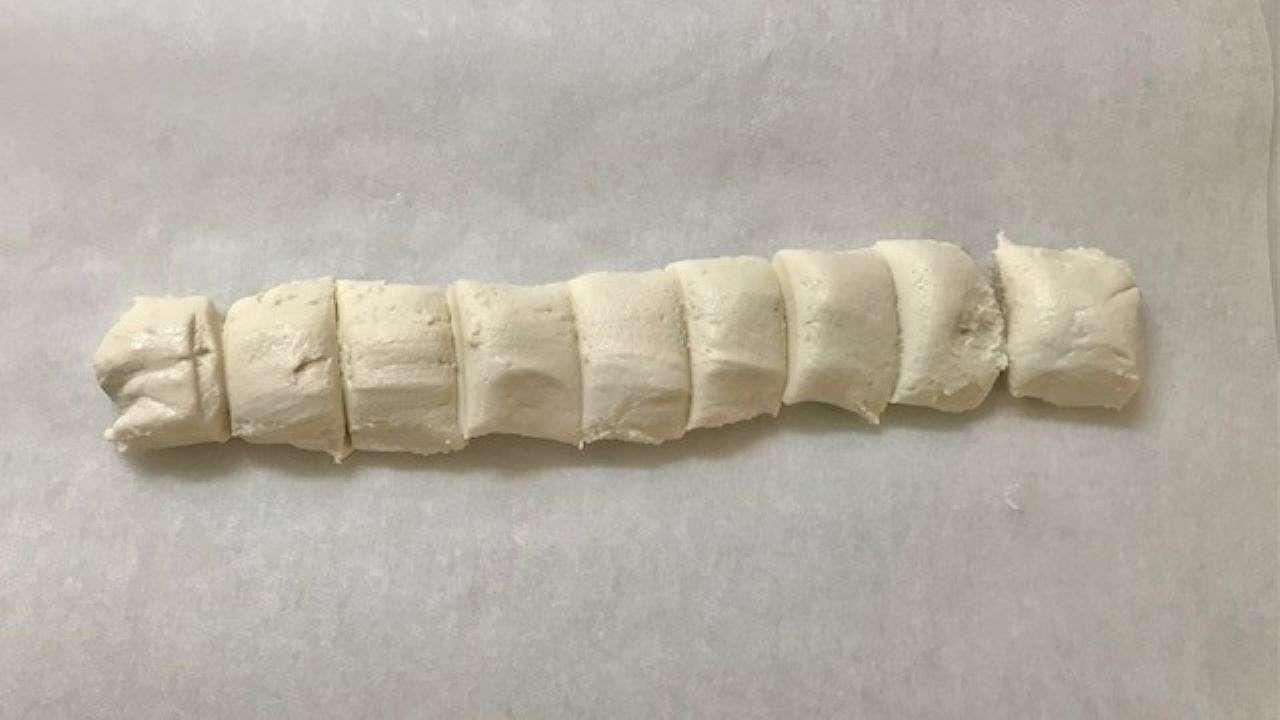 柔らかくなるまで手でこねたら棒状に伸ばして、9等分に切り分けます。