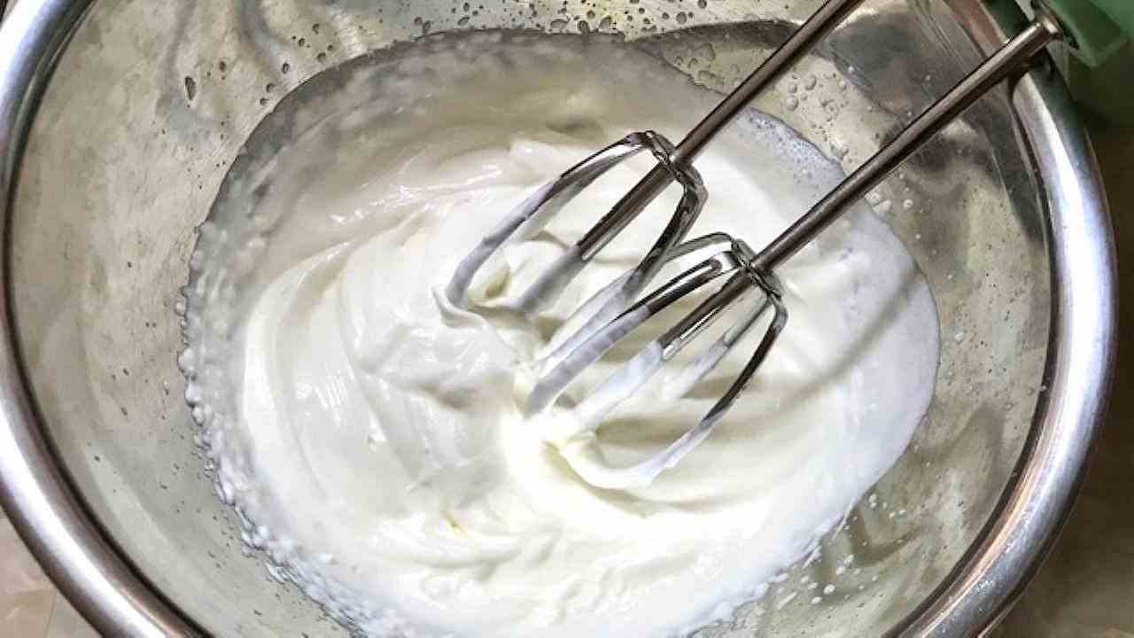 ボウルに生クリームを入れて8分立て(すくうと柔らかなツノが立っておじぎをする状態)に泡立てます。室温が高い場合は冷蔵庫へ入れておきます。