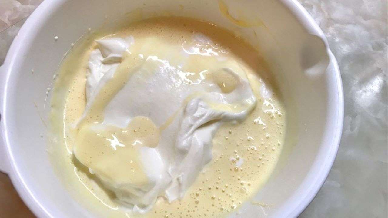 4へ5を混ぜながら入れたら、泡立てた生クリームを加えてゴムべらで混ぜ合わせます。