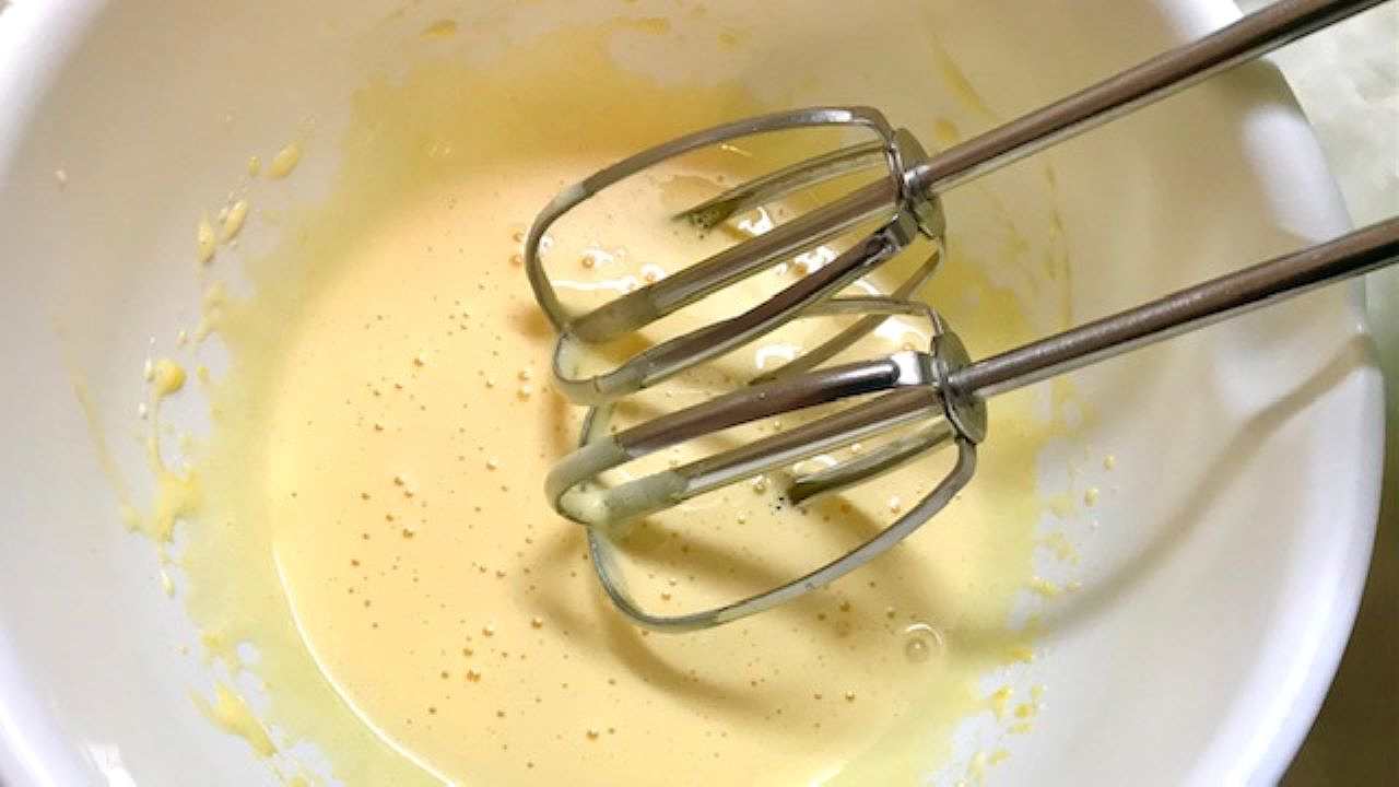 ボウルに卵黄、砂糖を入れ、白っぽくもったりするまでハンドミキサーで混ぜます。