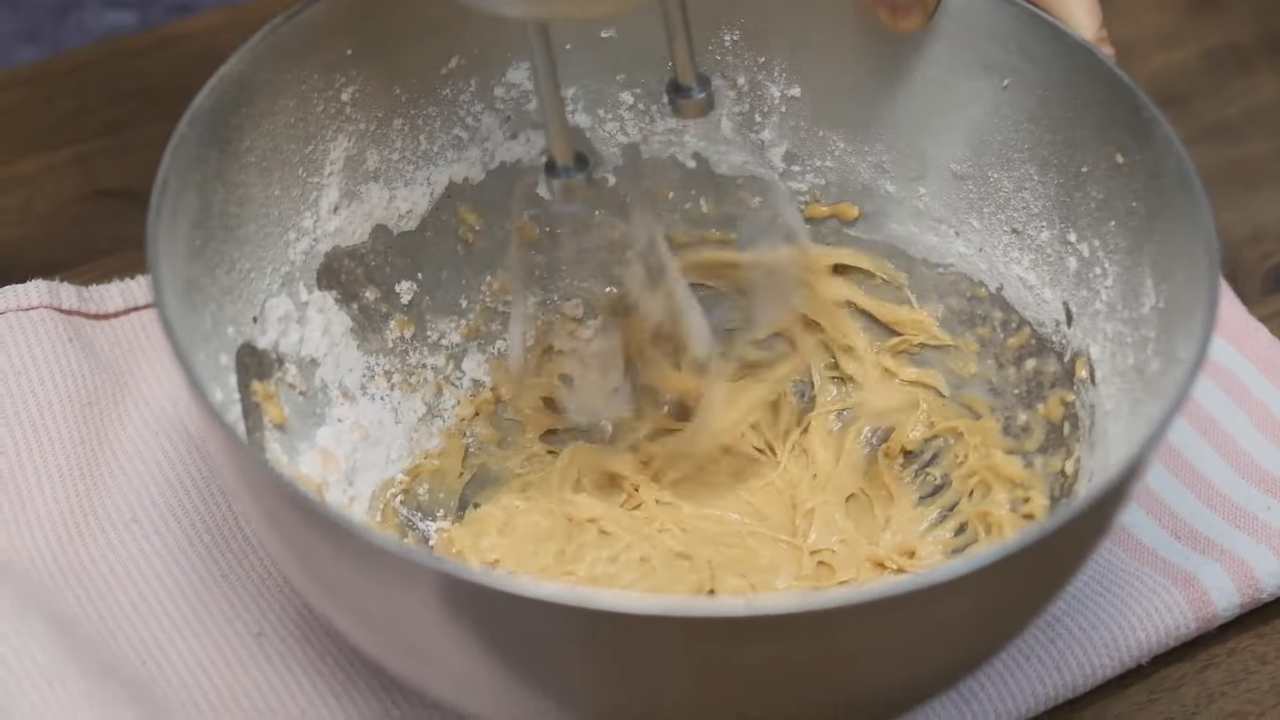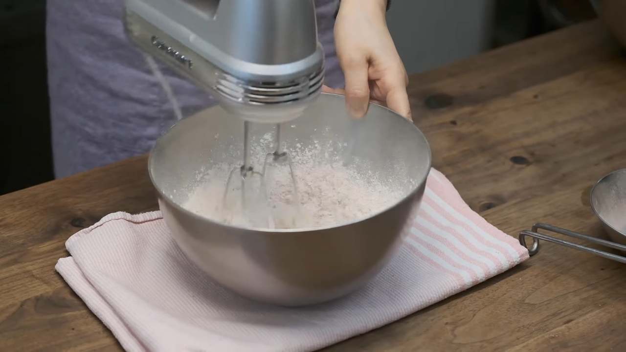 薄力粉、ベーキングパウダー、桜パウダーをふるい入れてしっかり混ぜる。- 3