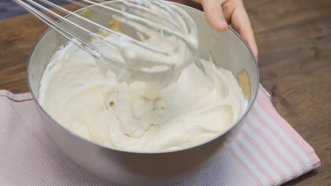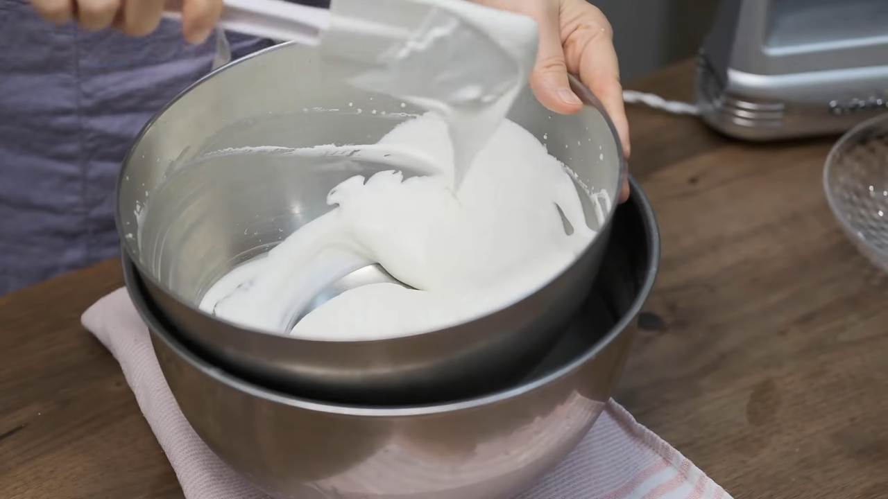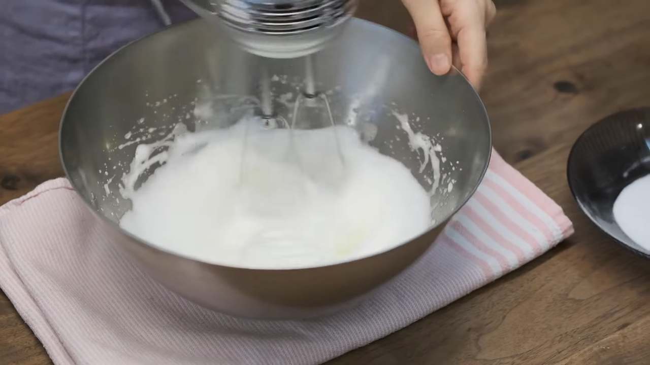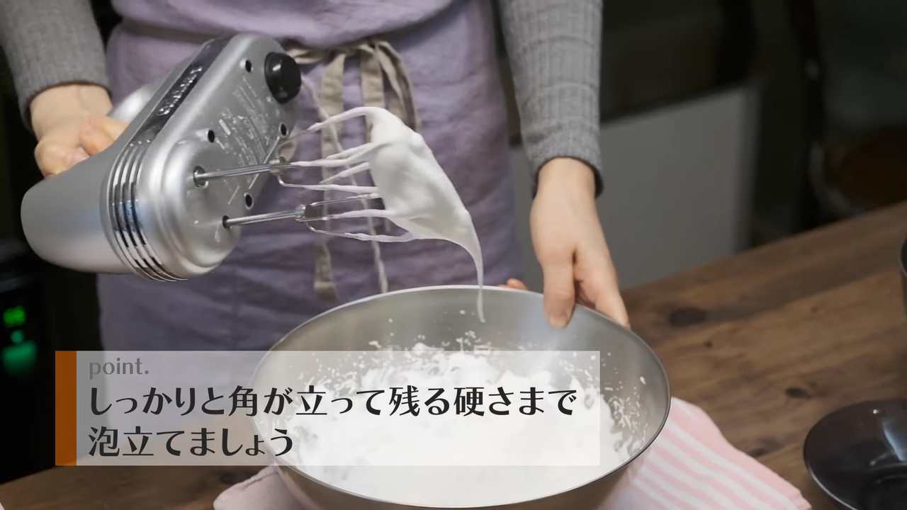 泡のキメをととのえて、よい状態のメレンゲにする。しっかりと角が立って残る固さまで泡立てる。