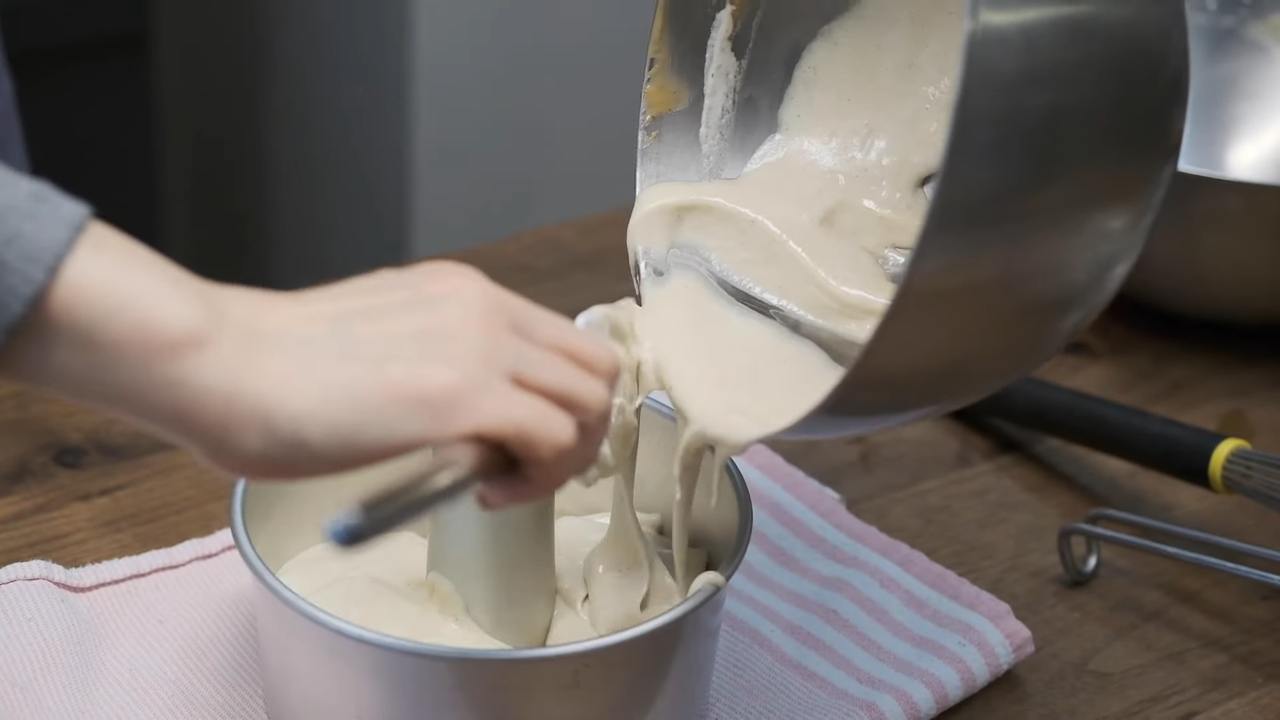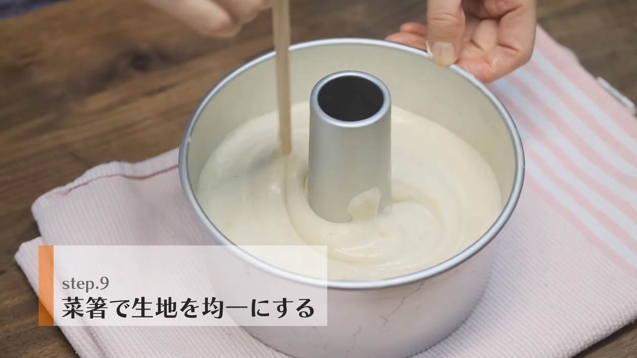 菜箸を型の外側から内側に向かって、ぐるぐると渦巻きを描くように動かして気泡をととのえる。170℃のオーブンで約20分間、160℃に下げて約25分間焼く。- 9