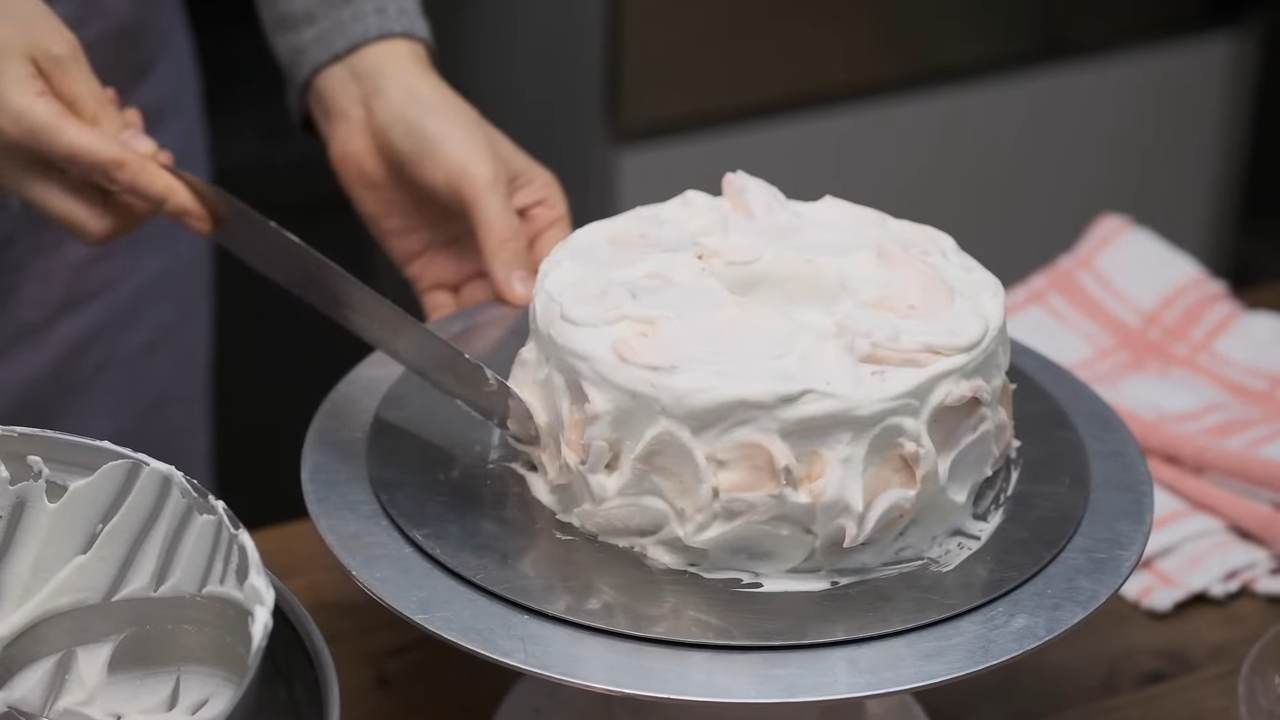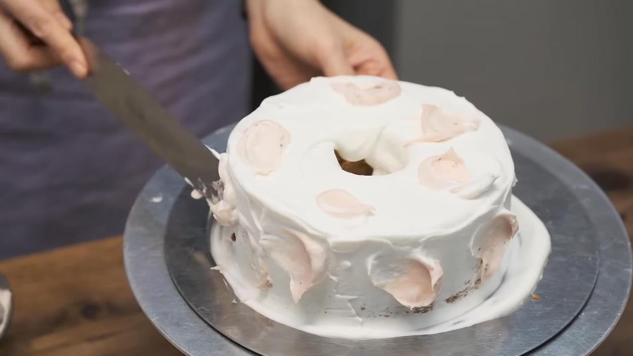 シフォンケーキの上から流して、上面、側面の順にパレットナイフで全体に塗り広げる。- 3