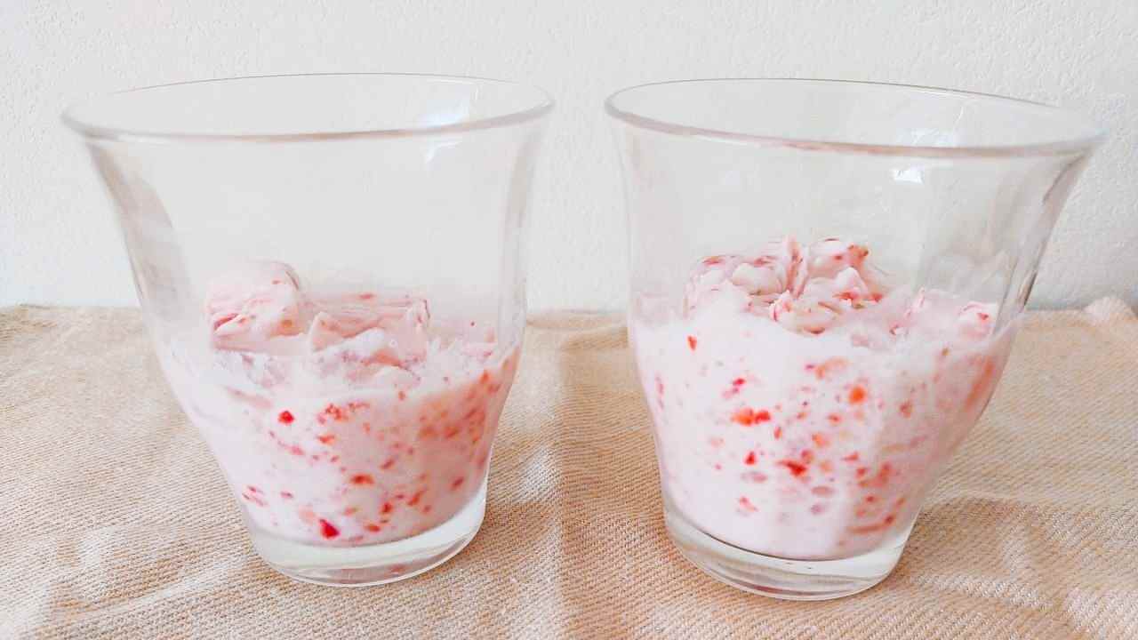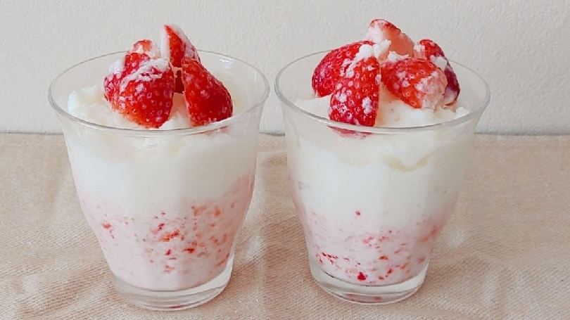 冷凍庫から取り出し、凍らせた③のイチゴを数個取り、飾り用に残しておく。残りと(★)牛乳を、ふわっとする程度にミキサーにかけて、カップの底に注ぐ。