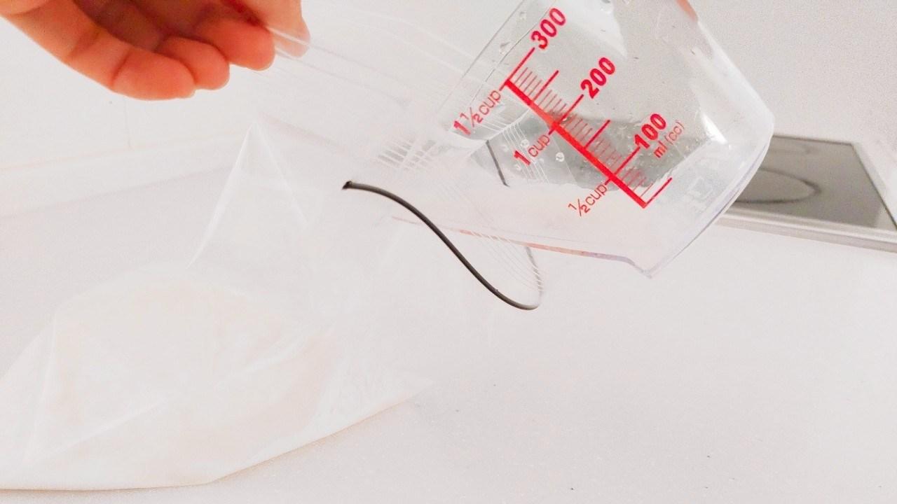 (A)のカルピスの原液・牛乳をフリーザーパックに入れ、軽く振って混ぜ合わせる。