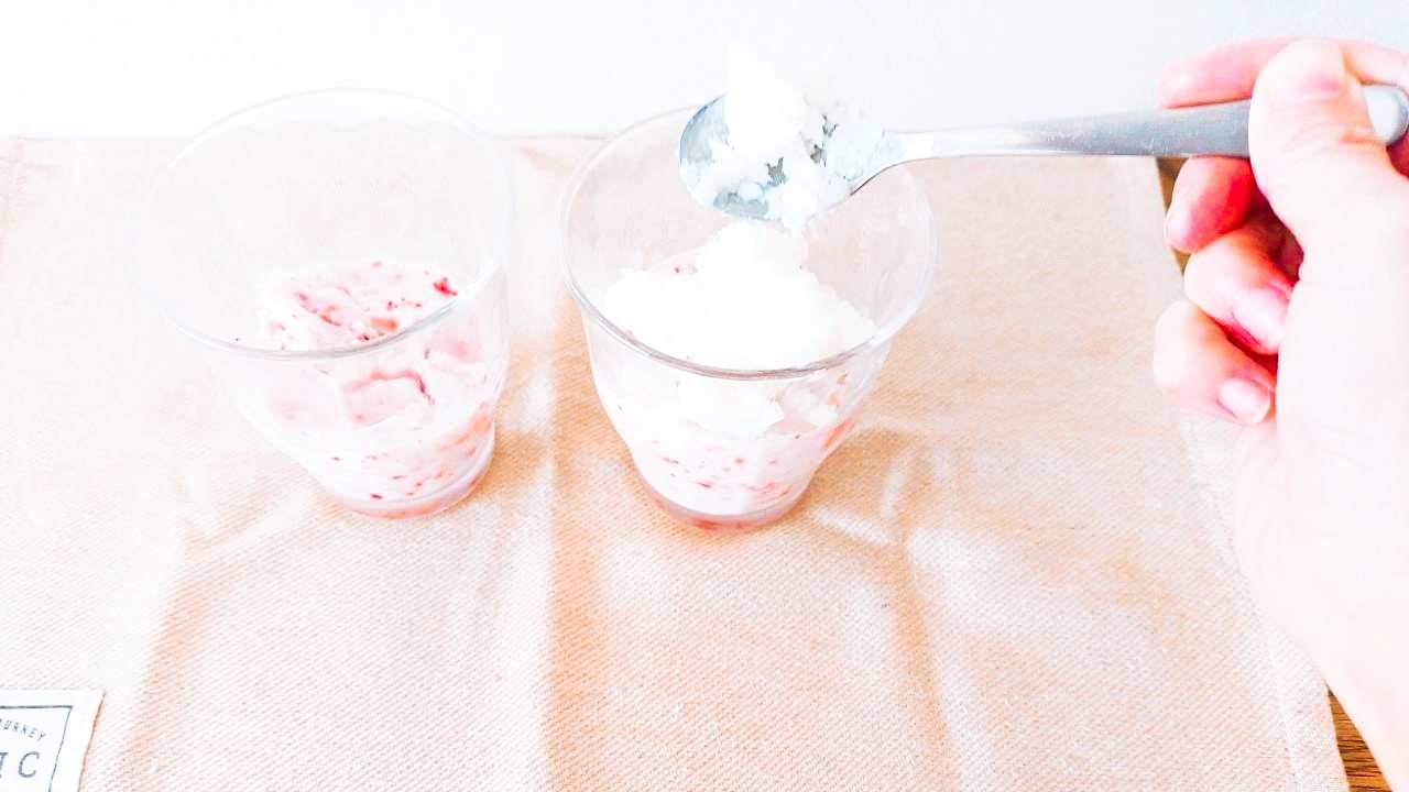 凍らせた②は、手でもみほぐし、全体がほぐれてふわふわになったら、先程のカップに盛りつける。