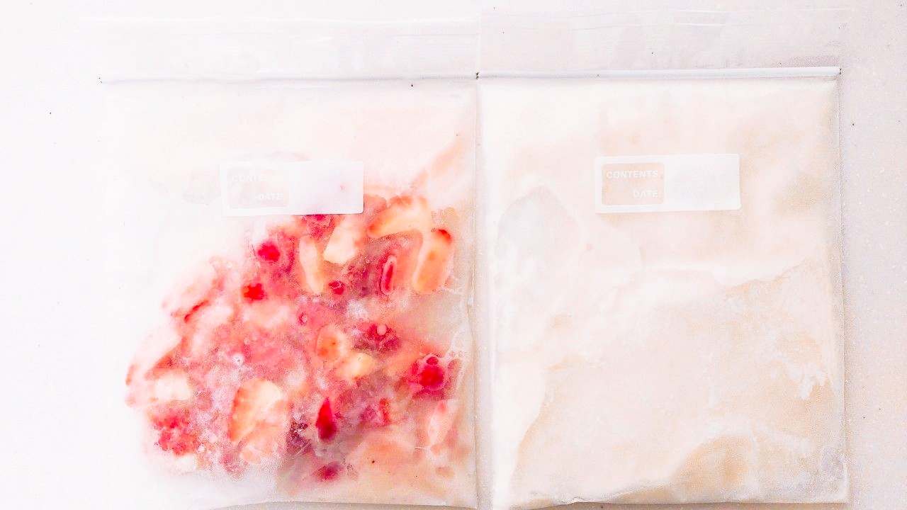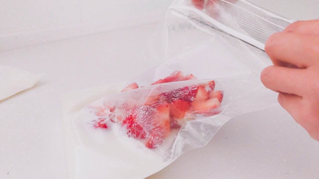 (B)のカルピスの原液・牛乳と、先程カットしたいちごをフリーザーパックにいれ、軽く振って混ぜ合わせる。