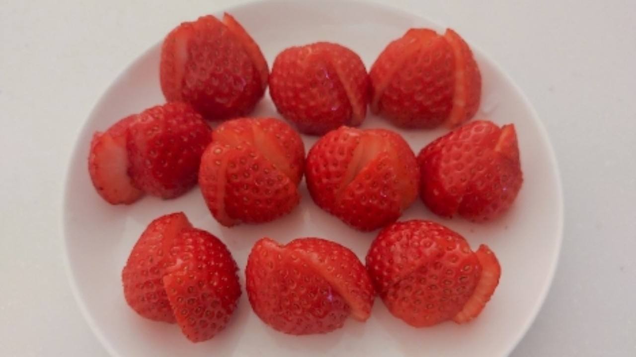 いちごのヘタを切りおとし、包丁で四つ切りにカットする。