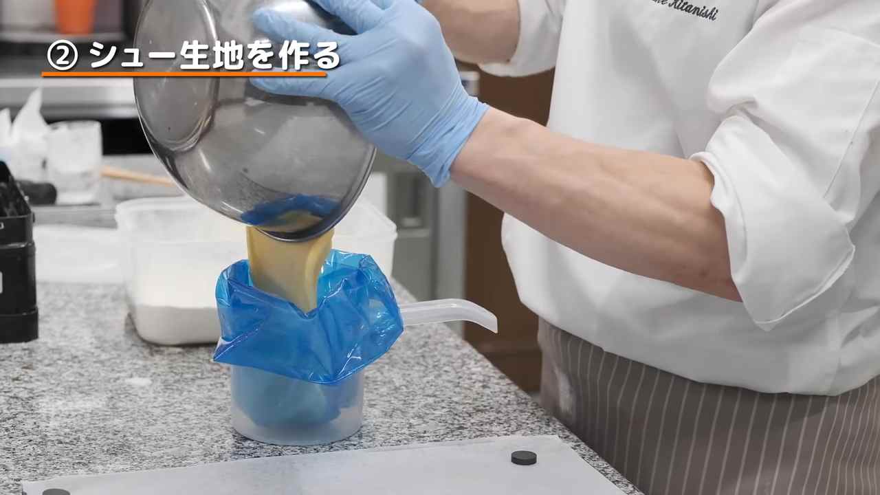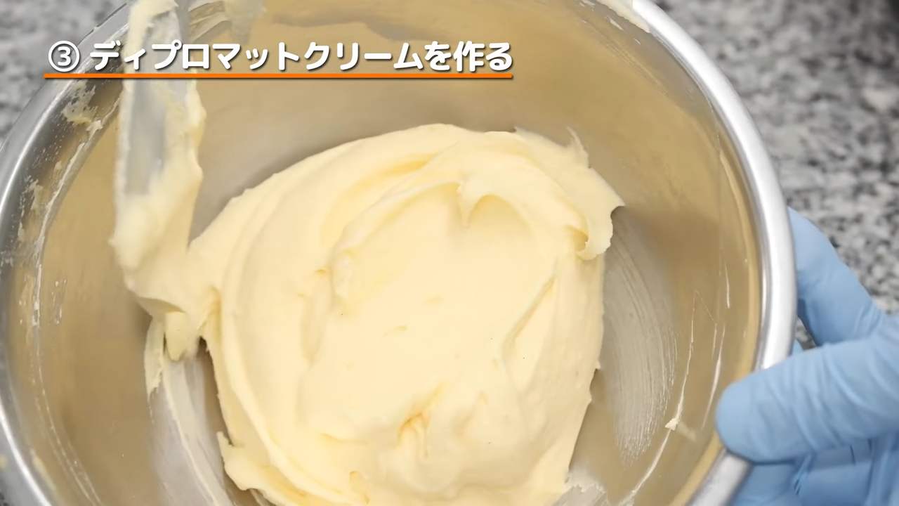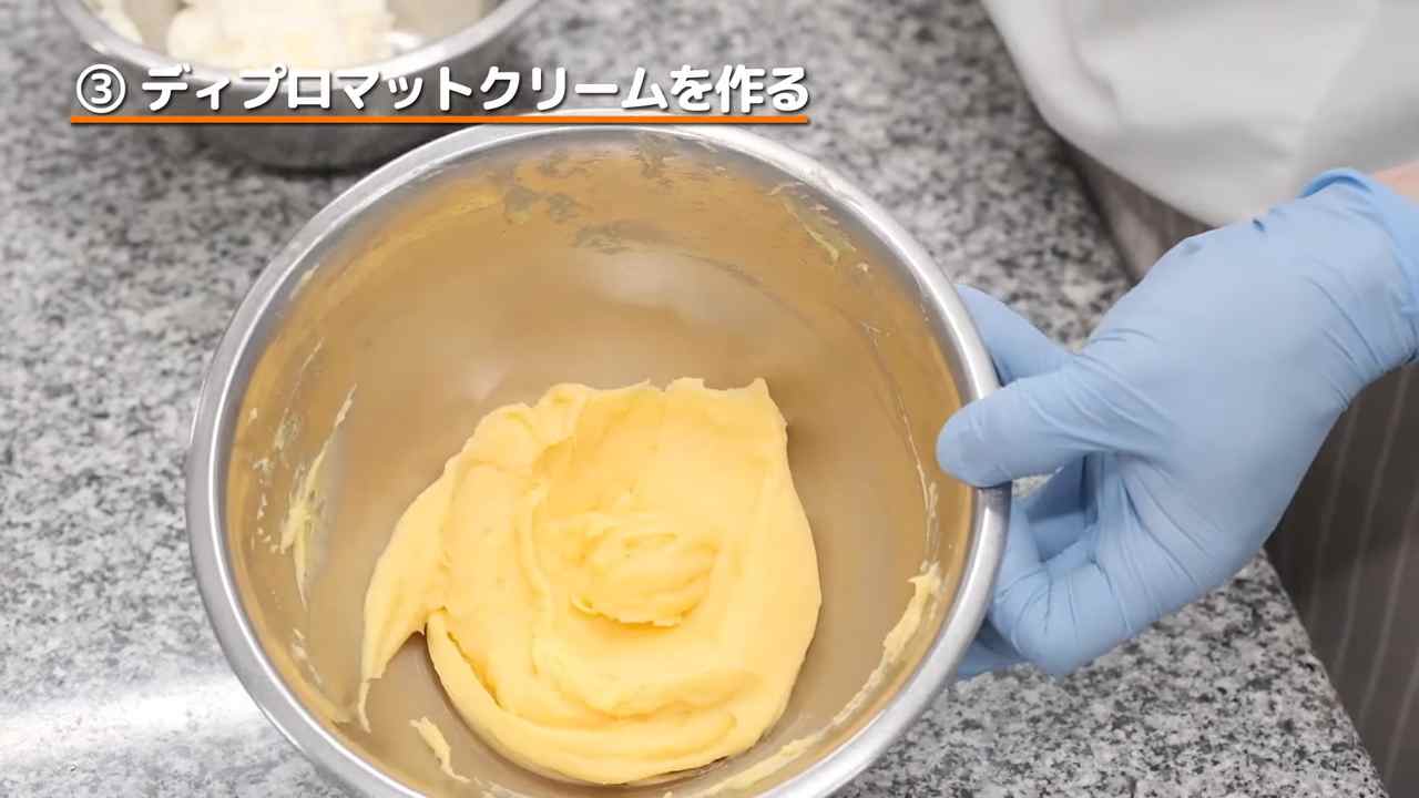 丸口金をセットした絞り袋に、ディプロマットクリームを入れる。- 3