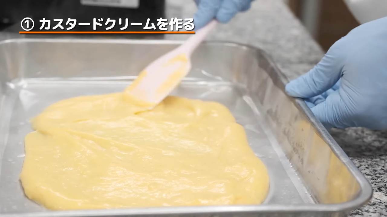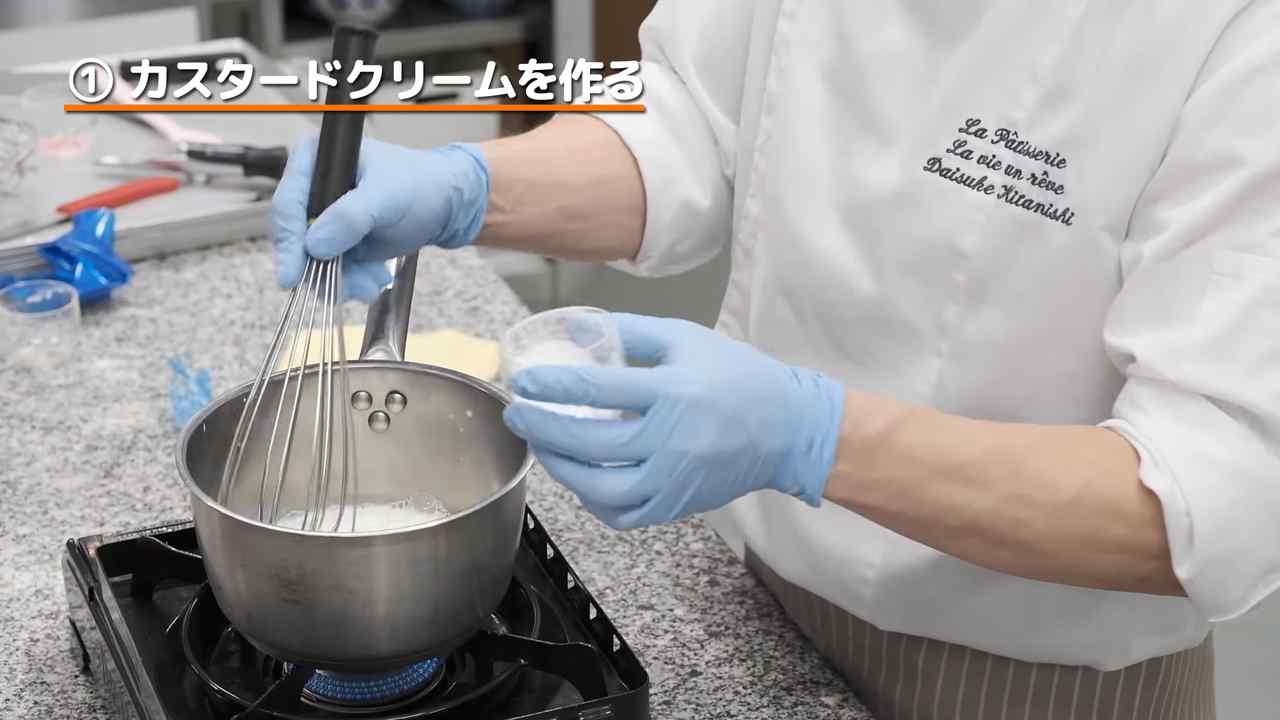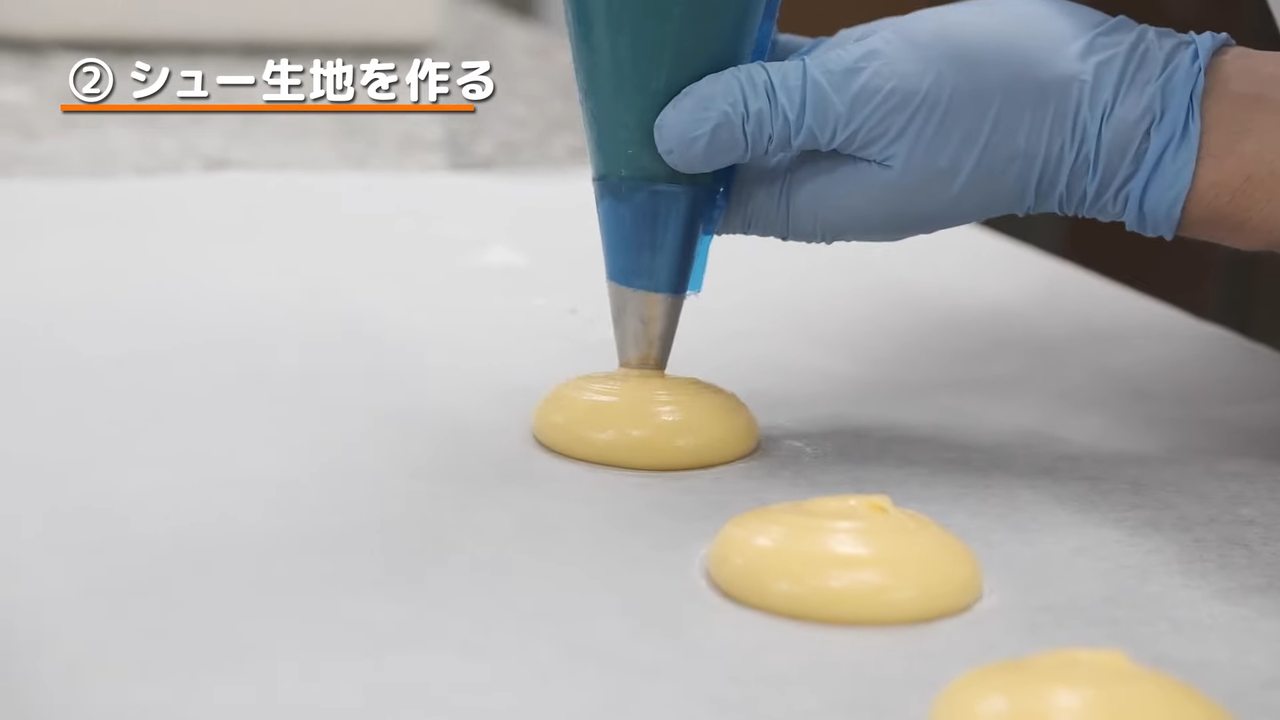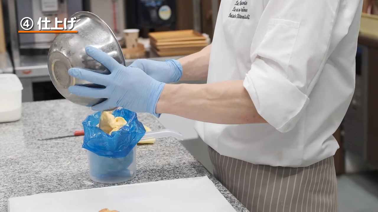 丸口金をセットした絞り袋に、ディプロマットクリームを入れる。- 3
