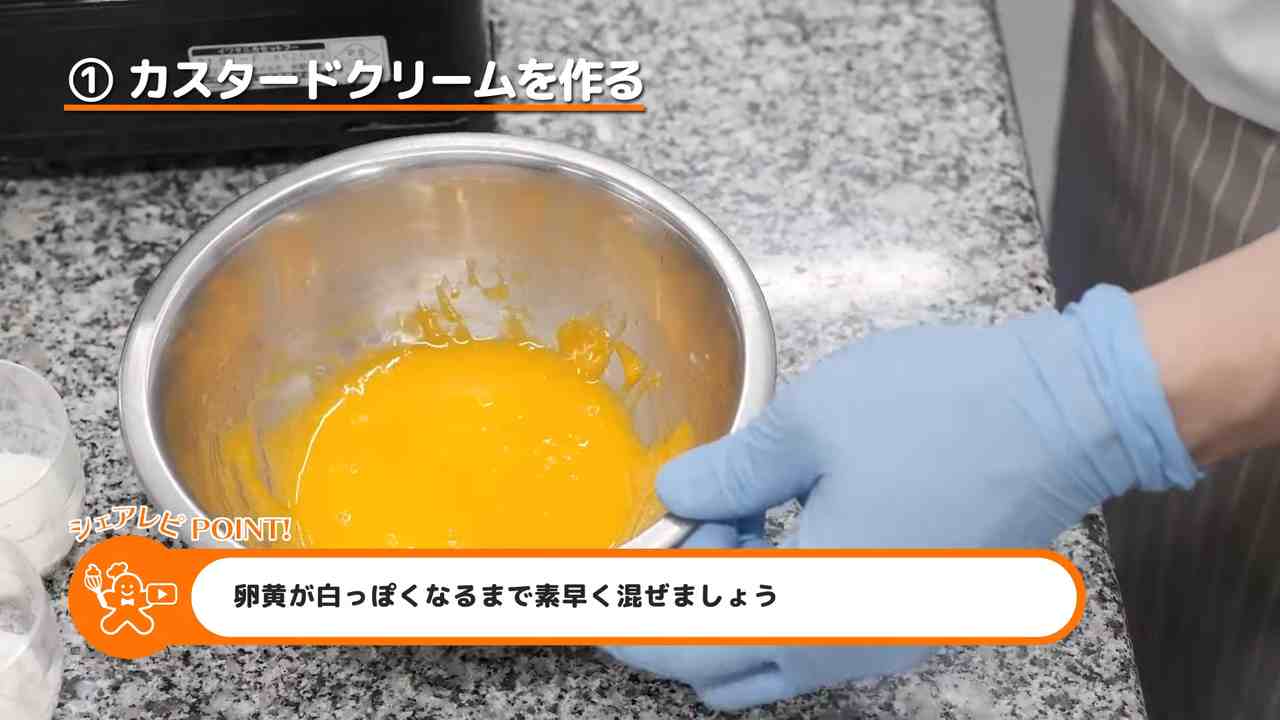 ボウルに卵黄を入れて溶きほぐし、残りのグラニュー糖を加えて白っぽくなるまでホイッパーで素早く混ぜる。- 4