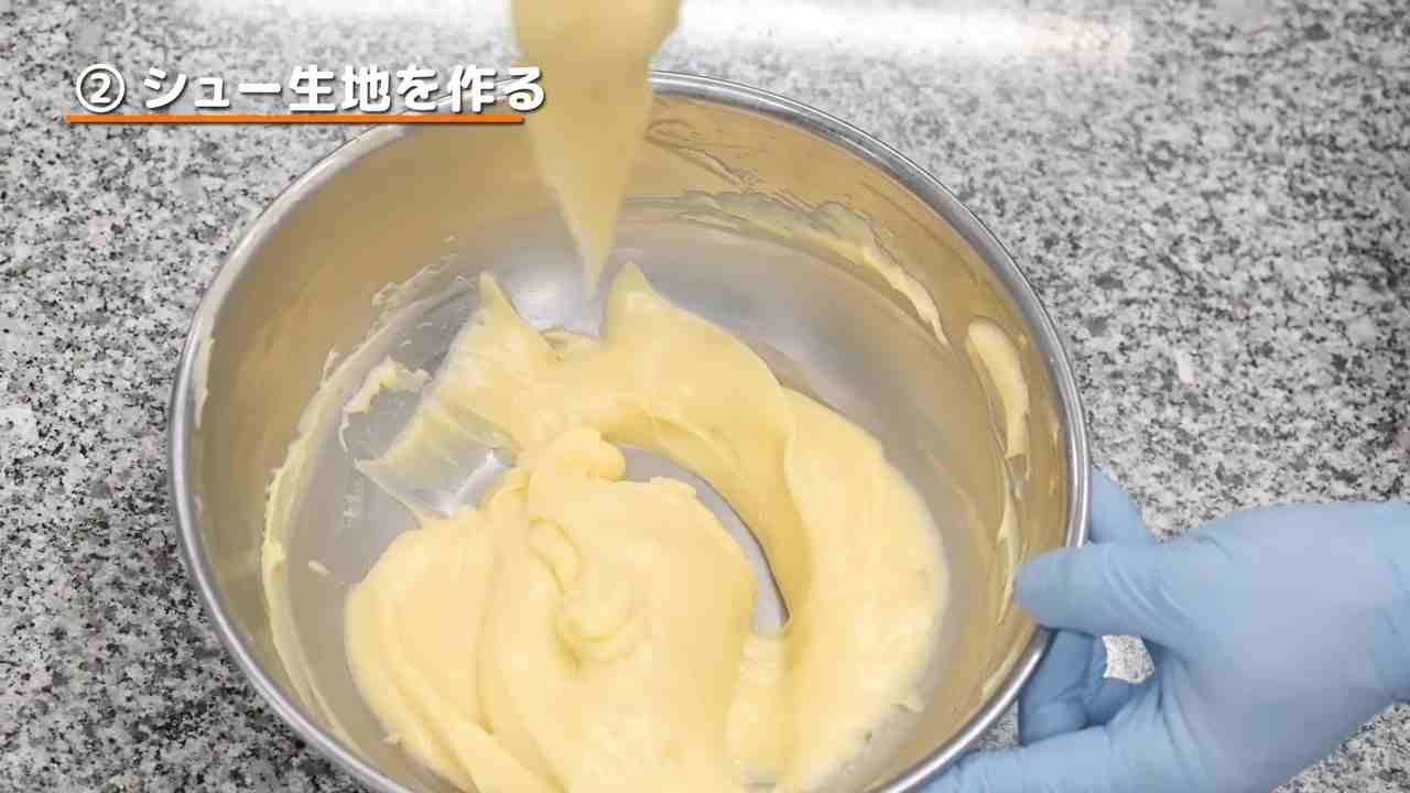 ボウルに移して、卵を1/3ずつ加えてその都度しっかり混ぜる。- 6