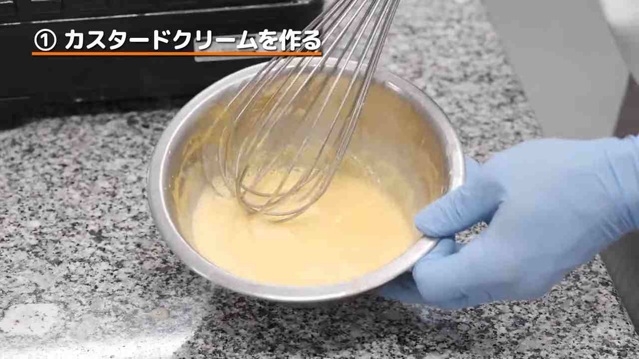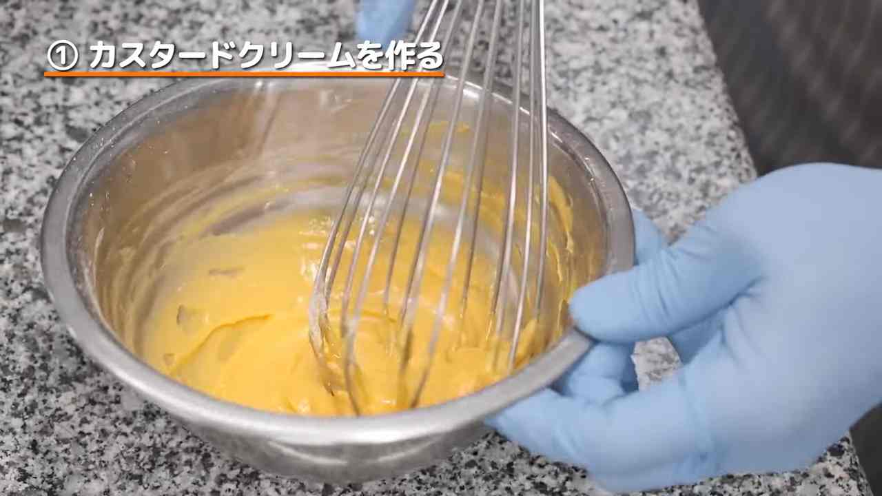 生クリームを硬めに泡立てる。冷凍庫から取り出したカスタードクリームをボウルに移してほぐす- 2