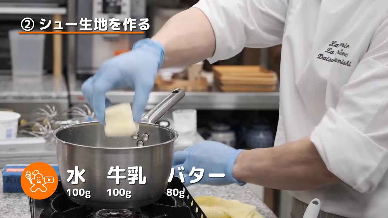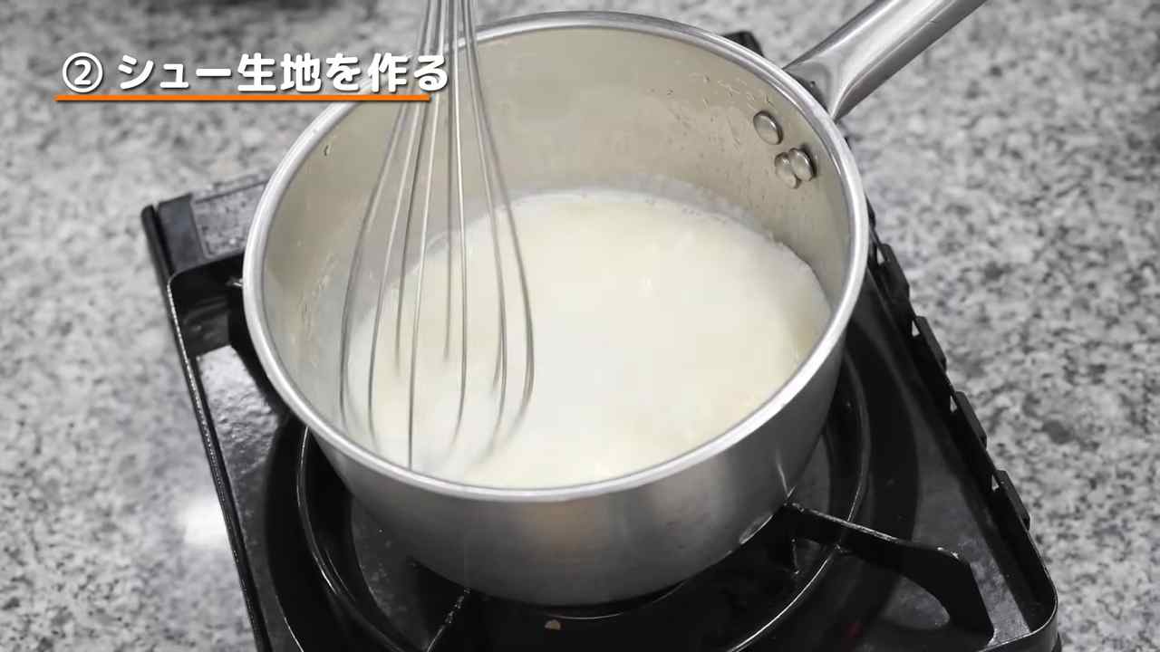 鍋に水、牛乳、バターを入れて沸かす。- 2