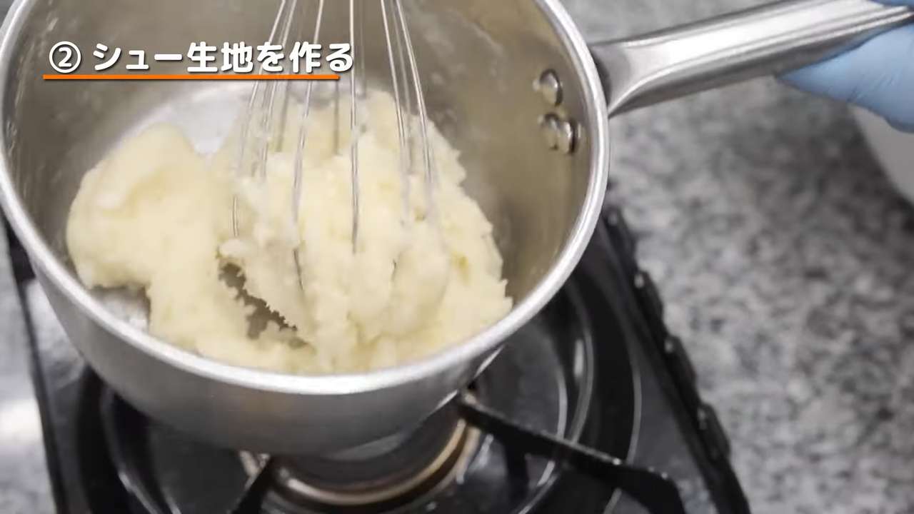 牛乳が残っている鍋に戻し、再度火にかけてホイッパーで混ぜ続ける。