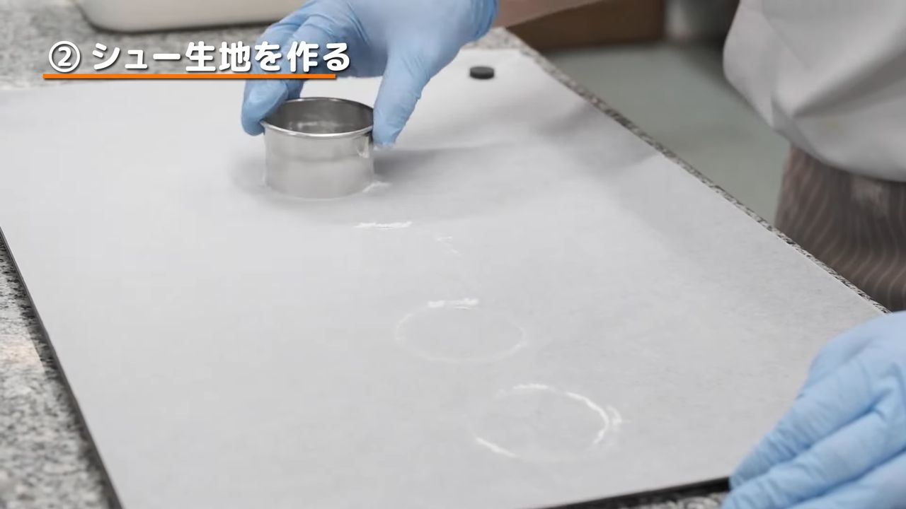 天板の上に、小麦粉を付けた直径6㎝の型で印を付ける。用紙の場合はオーブンシ