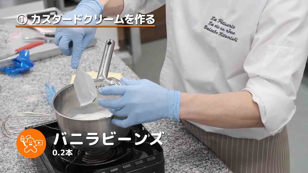 鍋に牛乳とバニラビーンズを入れて沸かす。- 2