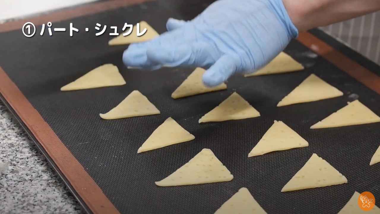 ムース・フロマージュブランの土台に使用するため、チーズの形の3角形にカットする。- 4
