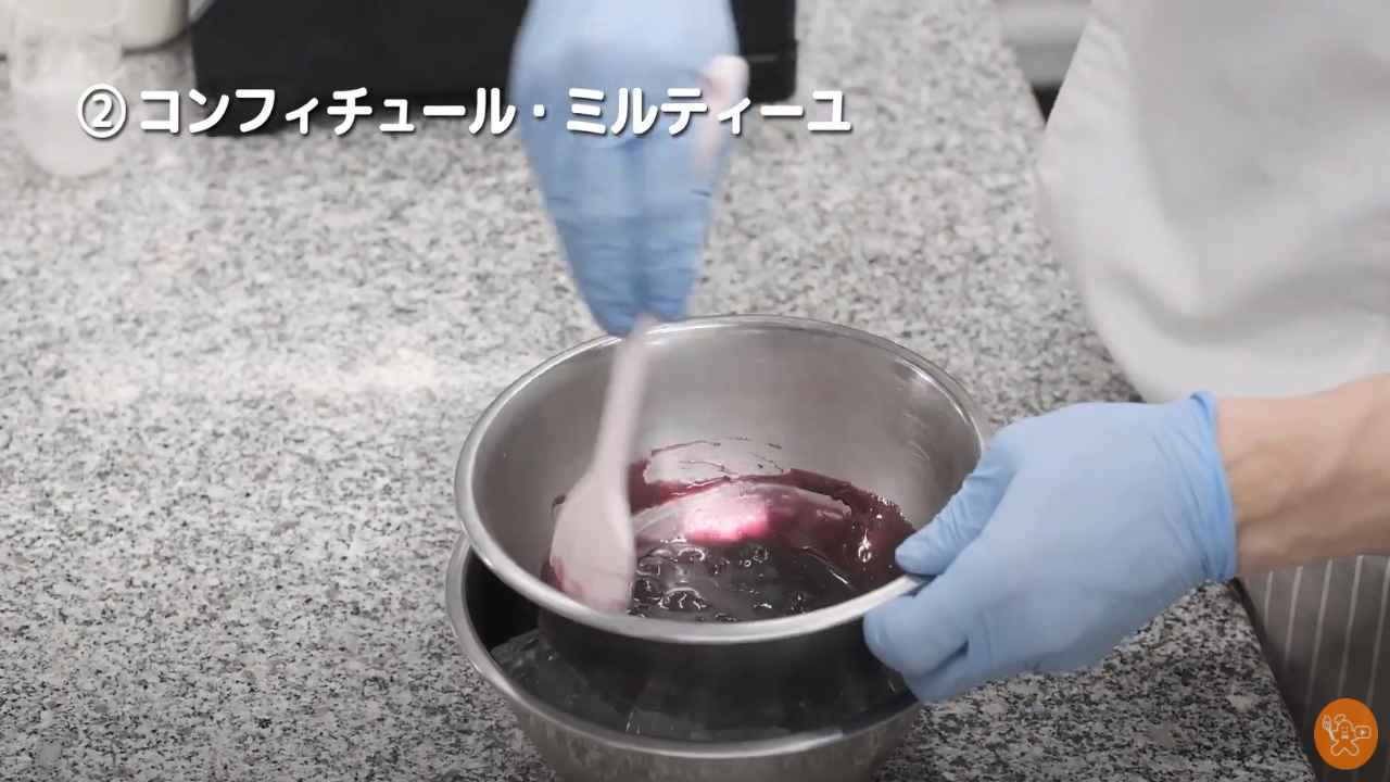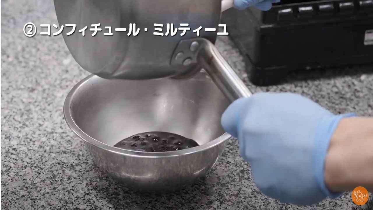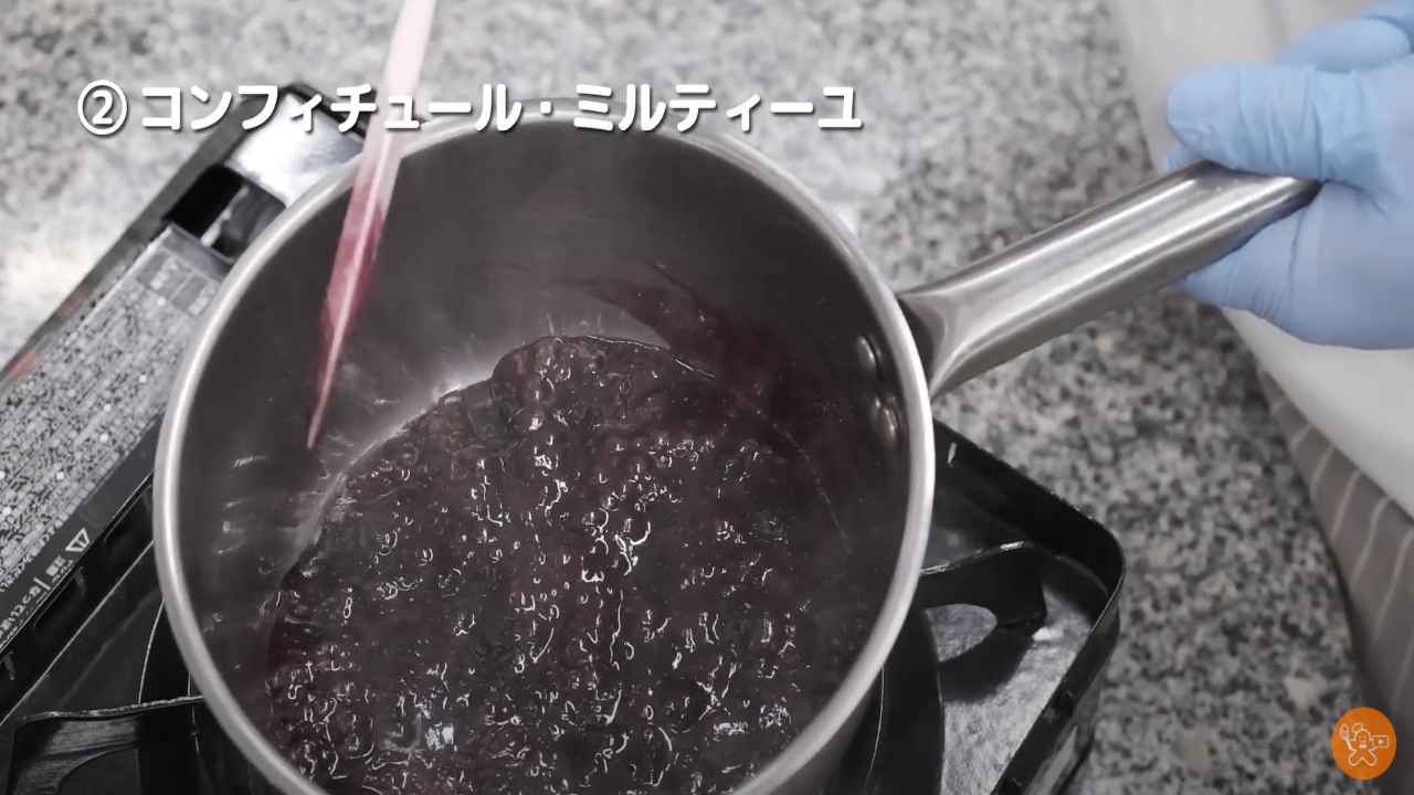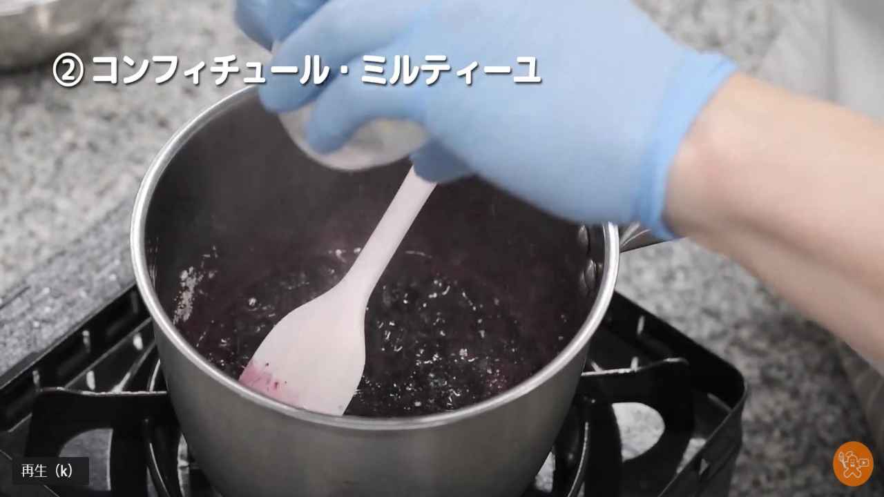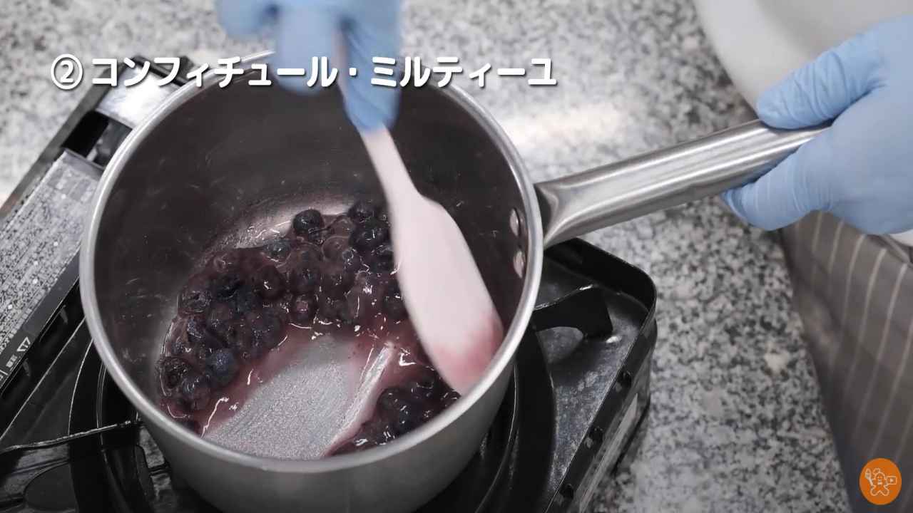 小鍋に冷凍ブルーベリー、グラニュー糖(60g)、水あめを入れて火にかけて混ぜながら炊く(糖度56°が目安)。- 2