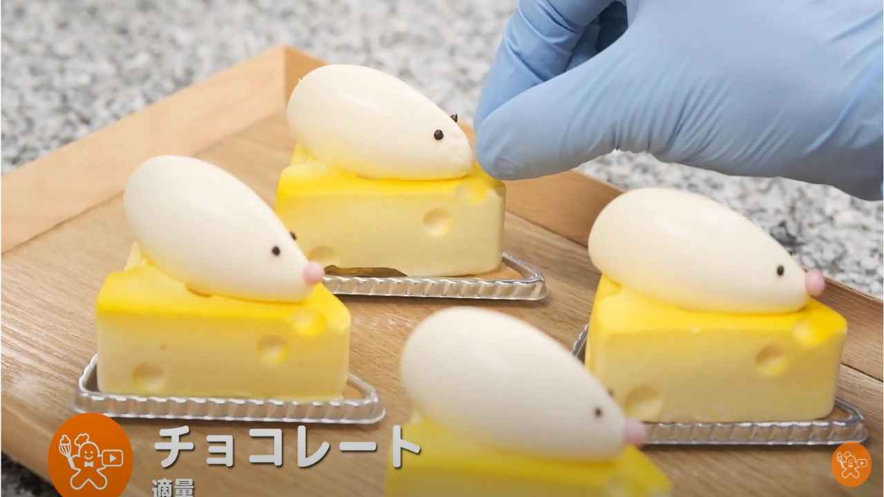 チョコペンでねずみの顔を描く。目と鼻のバランスが三角形になるようにするとバランスよくできる。- 5