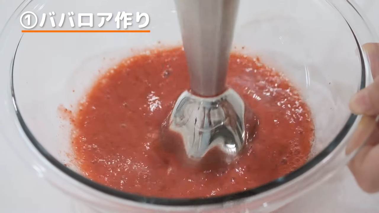 ハンドブレンダーで潰したいちごピューレ、ゼラチンを加えてよく混ぜる。