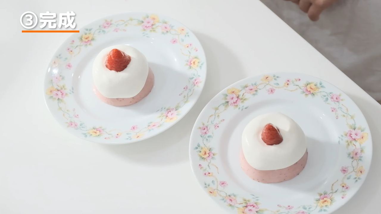 お皿の上に取り出し、生クリームといちごで飾り付けをする。