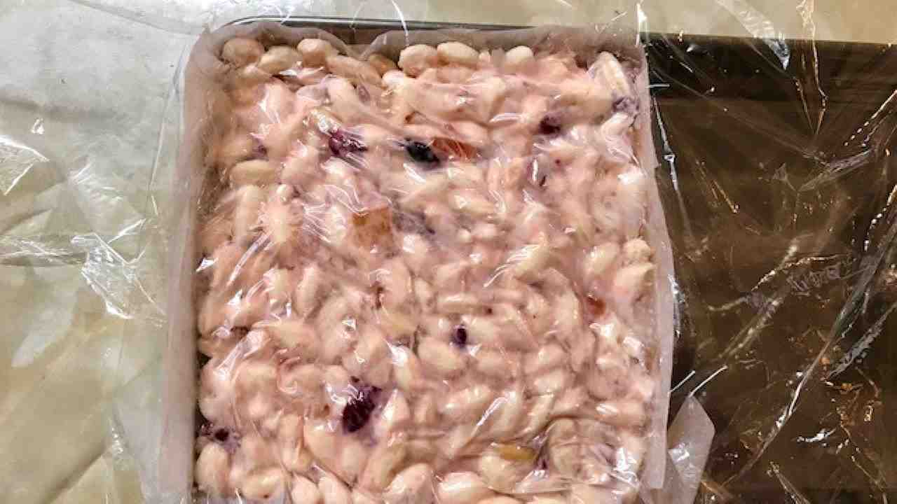 ピンク色のキュートないちごチョコレートにライスパフとドライフルーツ、ナッツをたっぷり入れました!