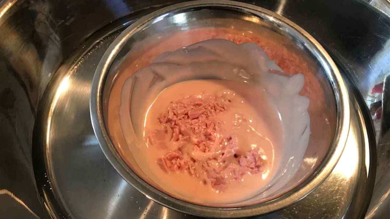 ボウルに刻んだいちごチョコレートを入れ、湯せんで溶かします。