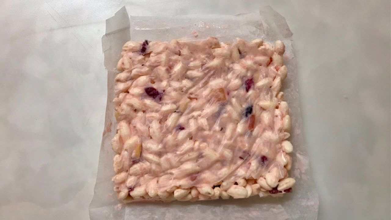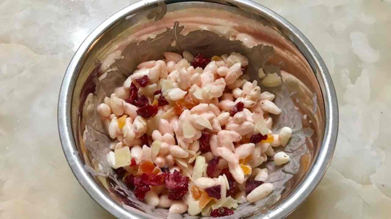 1へライスパフとアーモンドスライス、刻んだドライフルーツを入れ、菜箸で丁寧に混ぜ合わせます。
