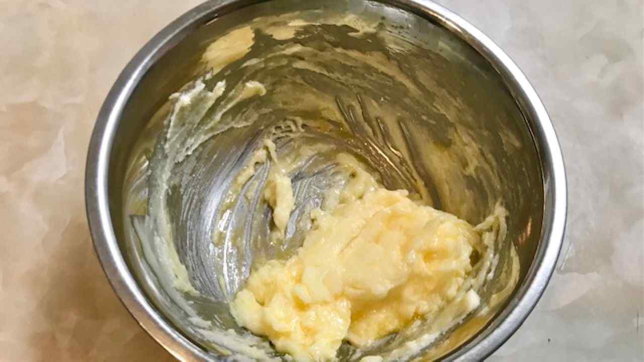 クリーム状に練ったバターに砂糖を加え、ふんわりなめらかになるまで泡立て器で丁寧にすり混ぜます。