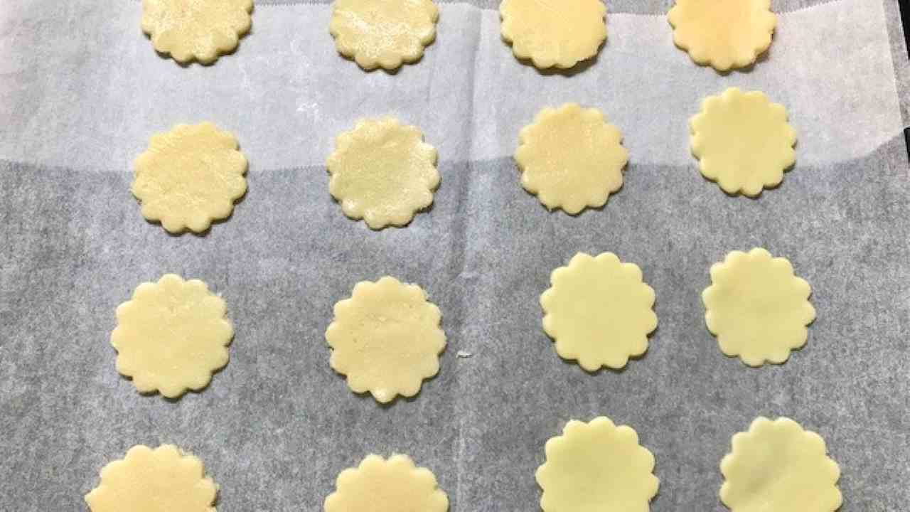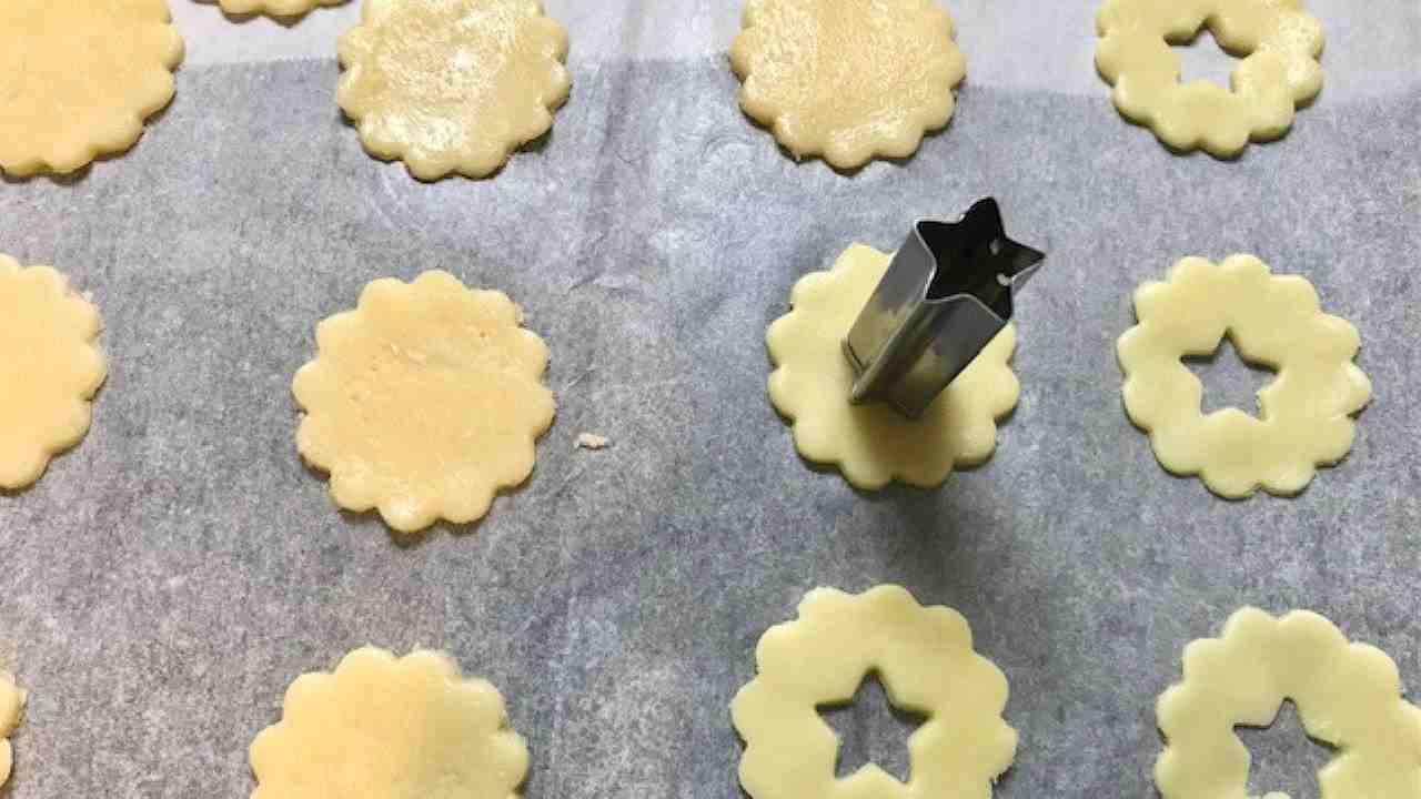 型抜きをします。型抜きをした生地はクッキングシートを敷いた天板に並べます。