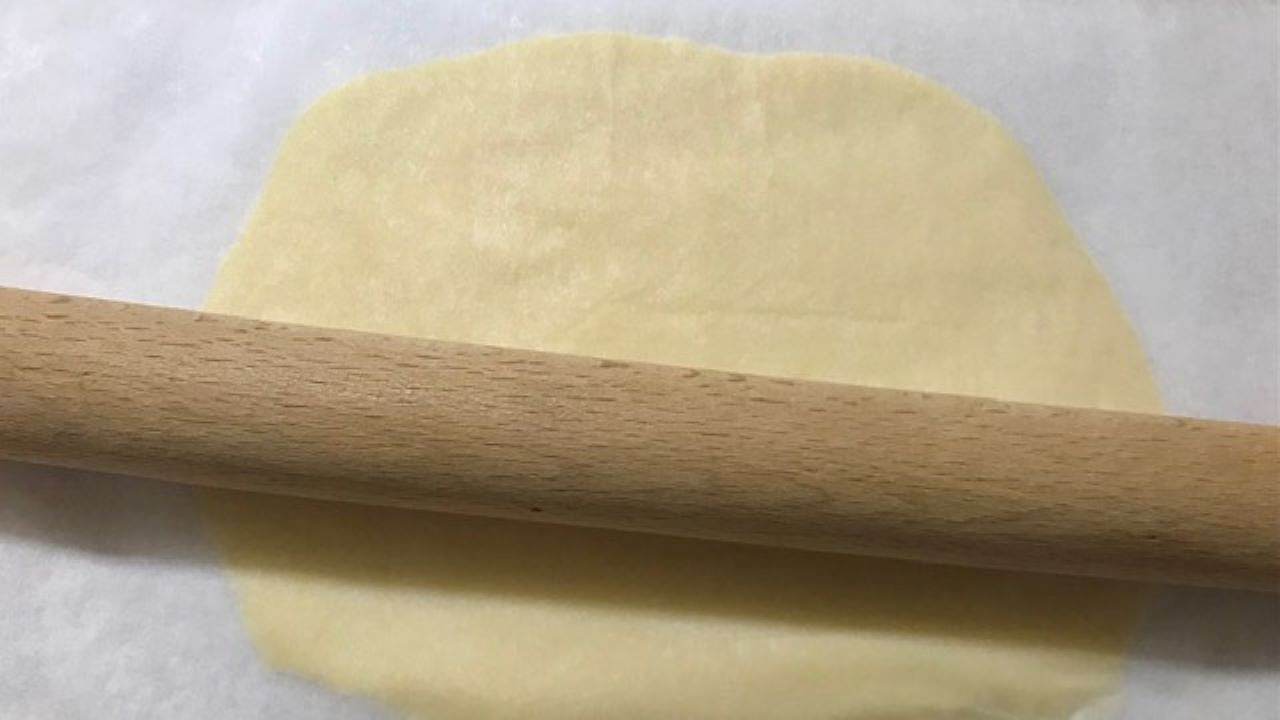 4の生地の上にクッキングシートなどをのせ、麺棒で約3mmの厚さにのばしたら再度冷蔵庫で休ませます(15分程度)。