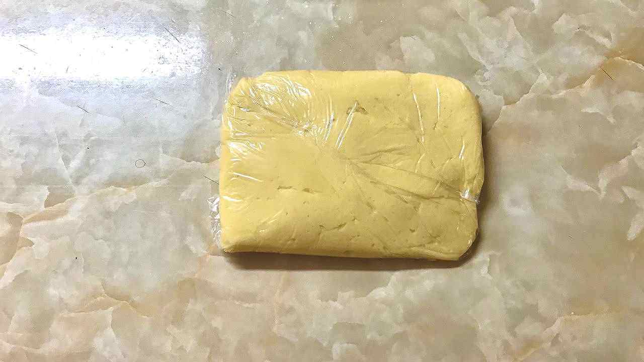 粉っぽさがなくなったら手でひとまとめにし、ラップで包み冷蔵庫で2時間程休ませます。