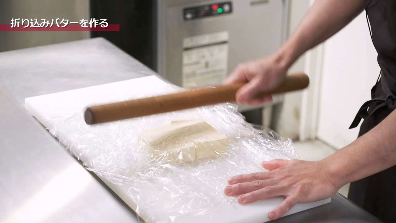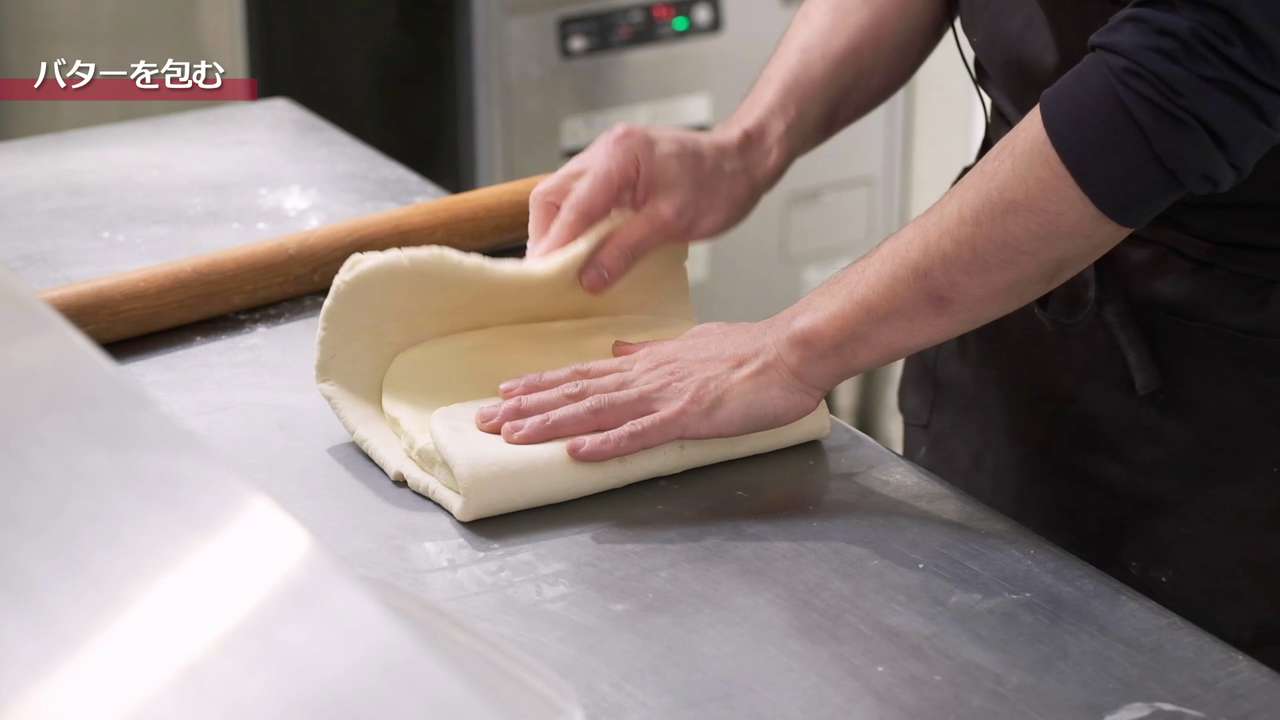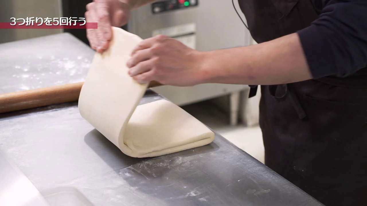 打ち粉は少量で行い、生地はデコボコした部分がなくなるように綿棒でグッグッと全体を押した後、真ん中を起点に「真ん中から上」、「真ん中から下」にのばし、均一に平らになるようにする。正方形の3つ分くらいの長さになったら3つ折りを2回行って3時間程度休ませる。「3つ折り2回、3時間休ませる」を2回繰り返して最後に3つ折りを1回行う。3つ折りは計5回行う。