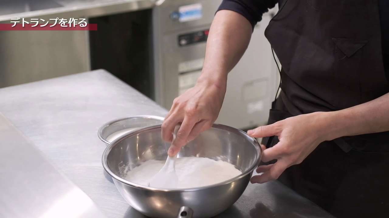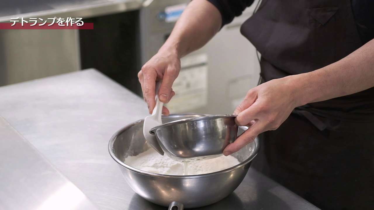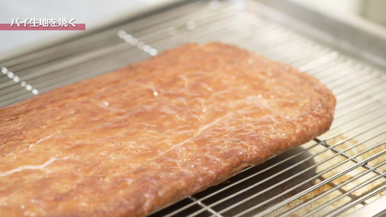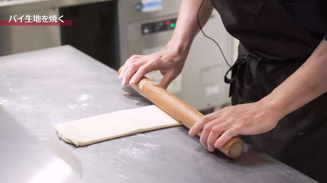 打ち粉は少量で行い、生地はデコボコした部分がなくなるように綿棒でグッグッと全体を押した後、真ん中を起点に「真ん中から上」、「真ん中から下」にのばし、均一に平らになるようにする。正方形の3つ分くらいの長さになったら3つ折りを2回行って3時間程度休ませる。「3つ折り2回、3時間休ませる」を2回繰り返して最後に3つ折りを1回行う。3つ折りは計5回行う。
