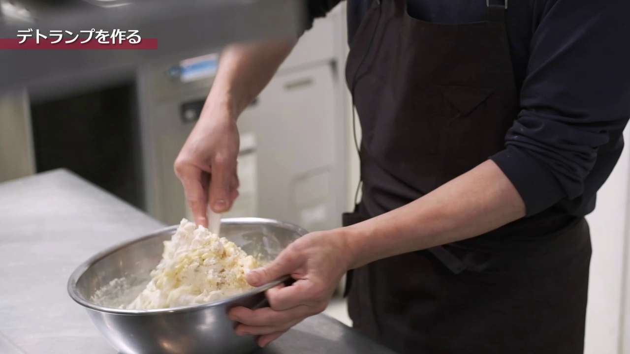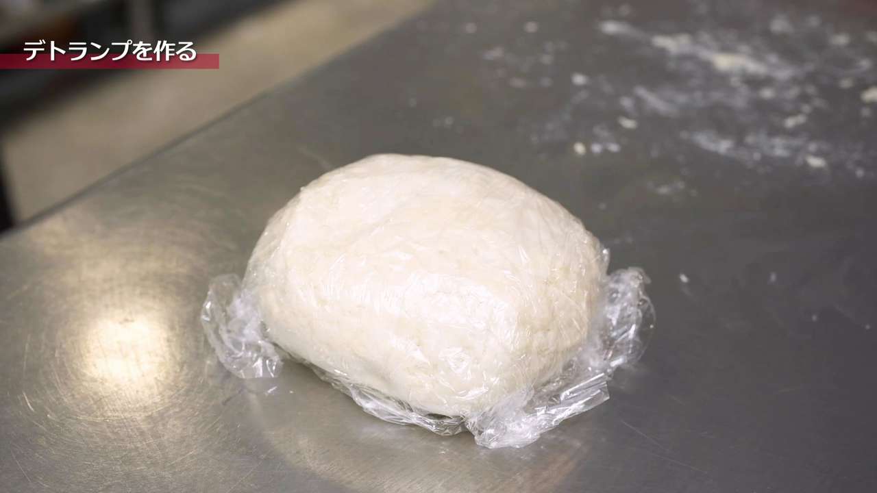 デトランプを整形したバターを包める大きさに伸ばして、空気が入らないように生地でバターを包む。角を合わせて行うと良い。