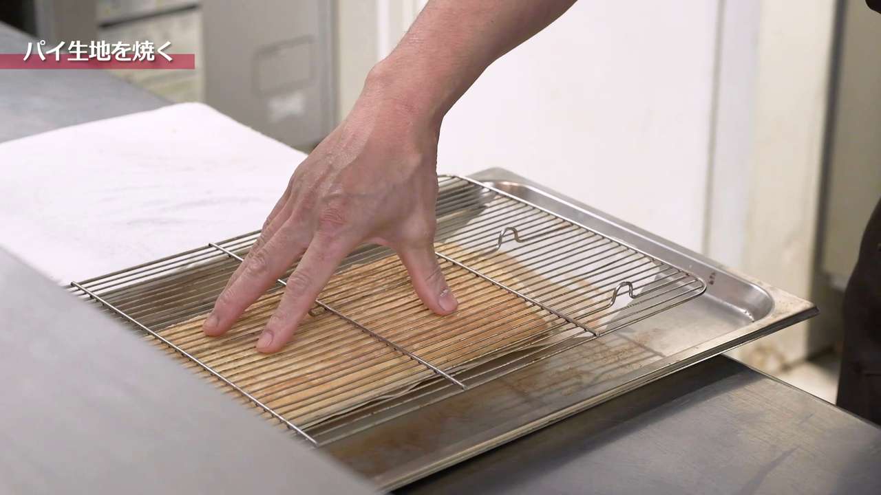 生地にパイローラーやフォークなどで穴を開けて、200℃(家庭用オーブンだと220℃くらいの高めに設定)に予熱したオーブンで約7分間焼く。